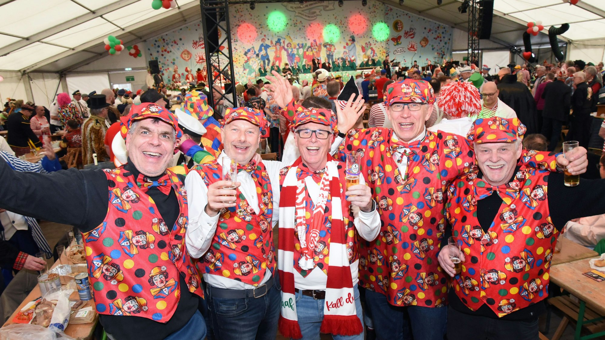 Gut drauf auch im halb vollen Zelt: Die „Schnellenbicker“, eine Männergruppe aus Schnellen- und Bickenbach, halten ihre Clownskostüme seit 20 Jahren in Ehren.