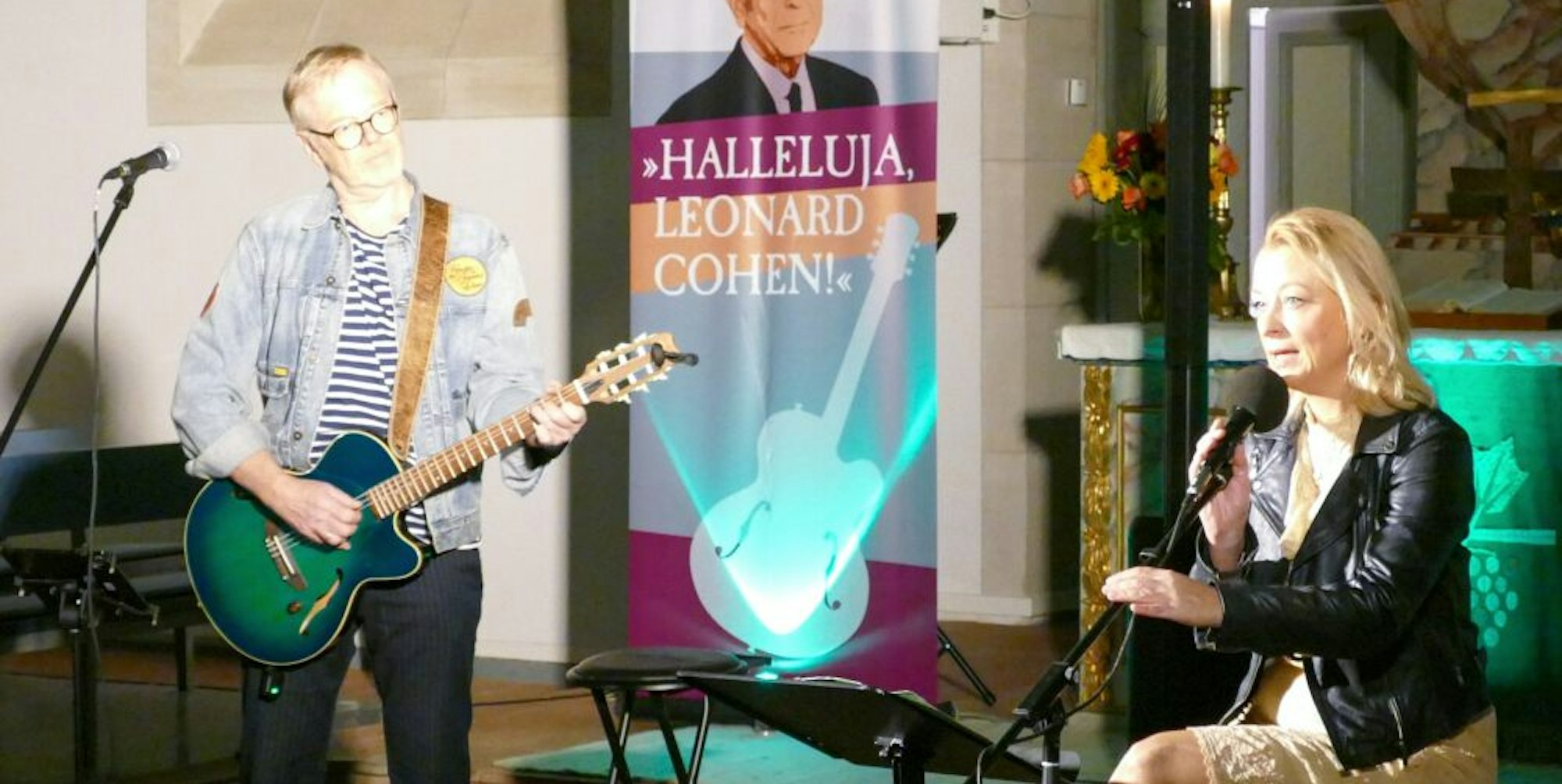 Autor Uwe Birnstein begleitet sie dabei an der Gitarre und führte in die Songs ein. Birnstein hat Cohens Lebensgeschichte in einer Biografie aufgezeichnet. Er erzählte in der Kirche, was den Musiker, geboren 1934 in Kanada, umtrieb. Er berichtete davon, wie Cohen als Schüler anfing Gedichte zu schreiben, später in Griechenland lebte, dann im legendären Chelsea Hotel in New York Teil der Friedensbewegung der 1960er Jahre wurde.