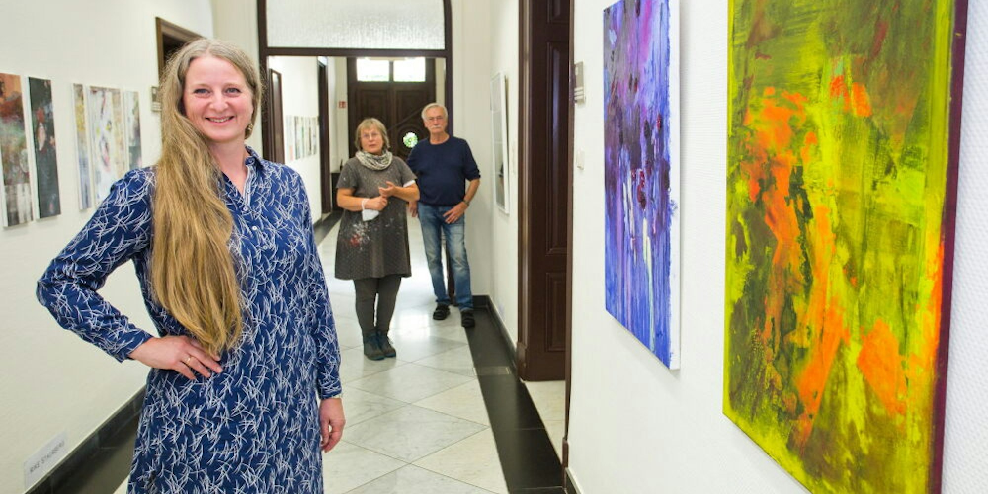 Die beiden sind dankbar, dass sie dort als Gäste des Bergischen Abfallwirtschaftsverbandes bis zum 18. September Bilder von sieben Künstlern zeigen dürfen, die eigentlich schon im März am Start waren. Im Vorfeld musste besonders für die Vernissage ein ausgeklügeltes Hygienekonzept entwickelt werden. Auf dem Flur herrscht Einbahnverkehr. Nur 14 Besucher dürfen gleichzeitig eingelassen werden. Darum setzen Stausberg und Leidig darauf, dass sich der Andrang über die vierstündige Eröffnungsveranstaltung entzerrt. Stausberg sagt: „Es ist ein Tastversuch.“