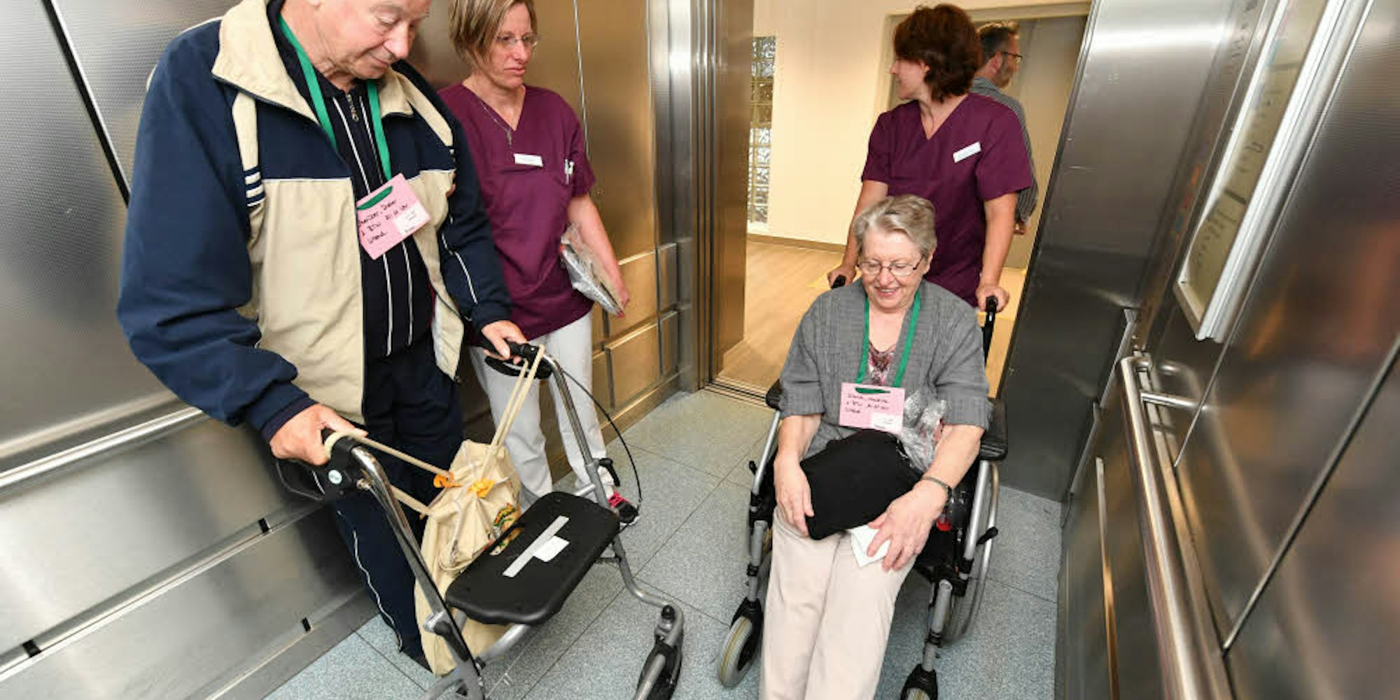 Wie alle geriatrischen Patienten, die gestern aus Lindlar kamen, hatten sie Identifikationskarten umhängen, so dass klar war, wer auf welches Zimmer sollte. Dieter Oberüber gibt zu: „Ich war schon etwas aufgeregt und habe heute Nacht auch ein bisschen unruhig geschlafen.“ Kaum ist der 78-Jährige in seinem neuen Zimmer angekommen, wird auch schon sein Nachtschränkchen ins Zimmer geschoben. Und noch einmal zwei Minuten begrüßt ihn eine „grüne Dame“ mit frischen Waffeln.