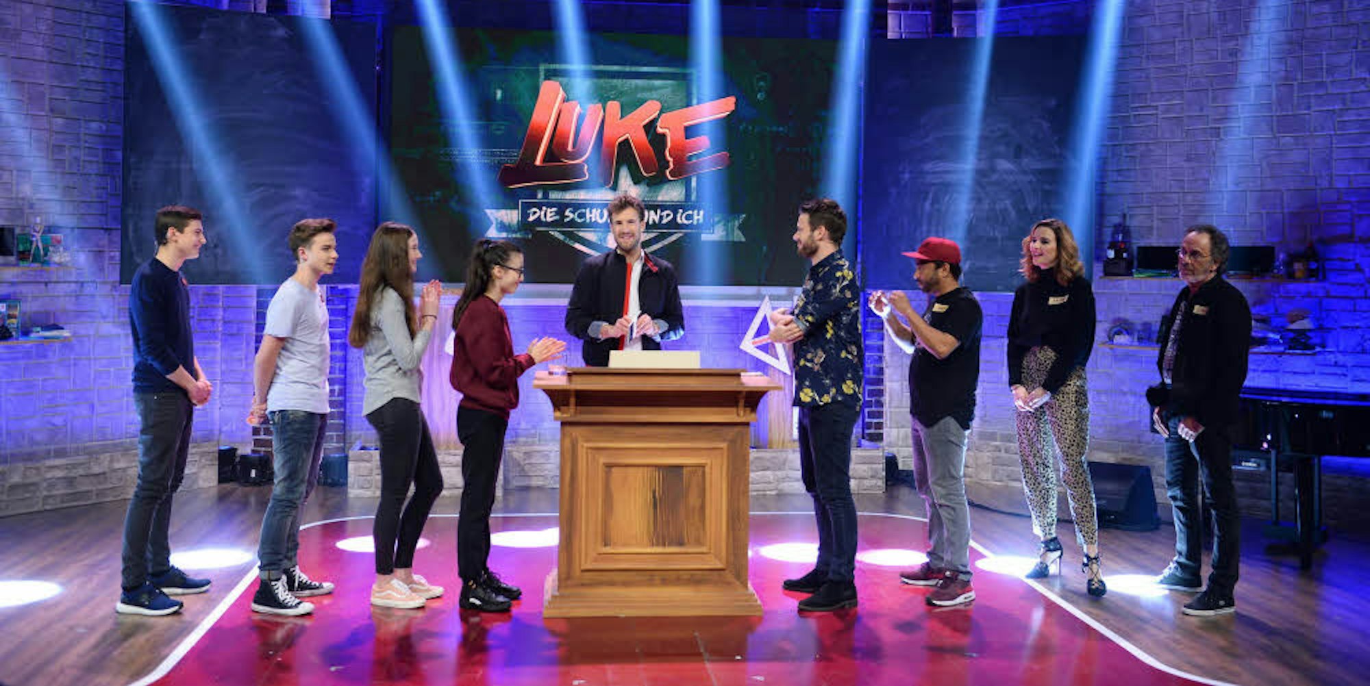 Schlaue Köpfe (v.l.): Raoul Domokos, Luca Berfeld, Johanna Angsten und Rana Beki mit Luke Mockridge sowie Johannes Strate, Simon Pearce, Katrin Bauerfeind und Hugo Egon Balder.