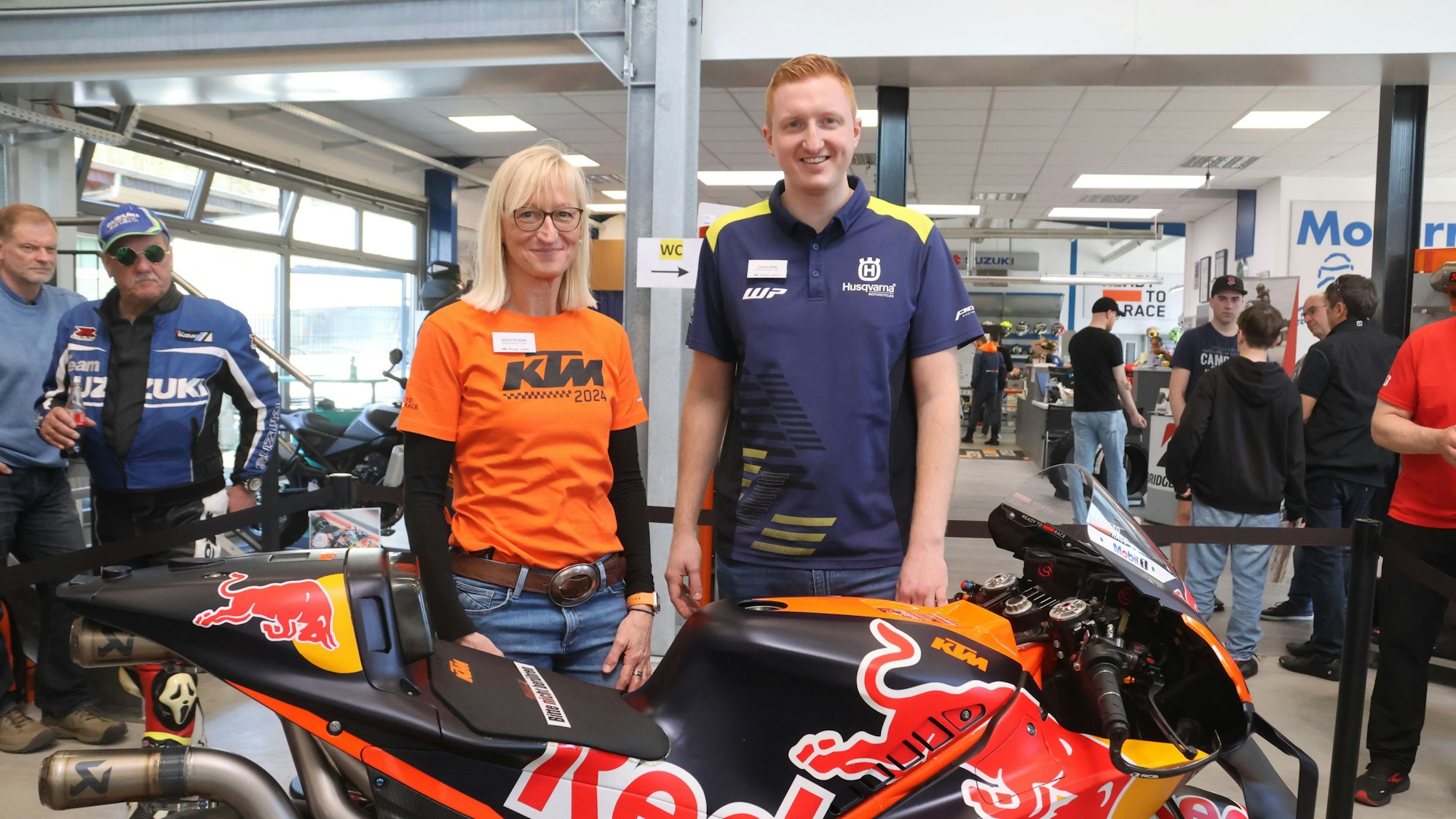 Ebenfalls als Meister beschäftigt ist Matthias Wiegand. Beide kümmern sich mit Leidenschaft um die Ausbildung. So hat Jonas Blumberg 2023 seine Gesellenprüfung als Zweiradmechatroniker bei der Handwerkskammer in der Fachrichtung Motorradtechnik als Bester abgelegt. Auf Landesebene schnitt er mit dem gleichen Ergebnis ab und wurde im Dezember in Berlin als Bundessieger gekürt. Highlights bei der Eröffnungsfeier waren die Vorführungen des slowenischen KTM-Stuntfahrers Rok Bagoroš. Auf zwei Maschinen zeigte er abenteuerliche Kunststücke, in die er auch die Engelskirchenerin Lisa Ufer mit einbezog. Anschließend enthüllten Mutter und Sohn Henn zwei WM-Rennmaschinen von Husqvarna und KTM, die ihnen die Hersteller zu Verfügung gestellt hatten. Lukas Henn ist begeistert: „Die bestehen fast komplett aus Karbon und Titan.“