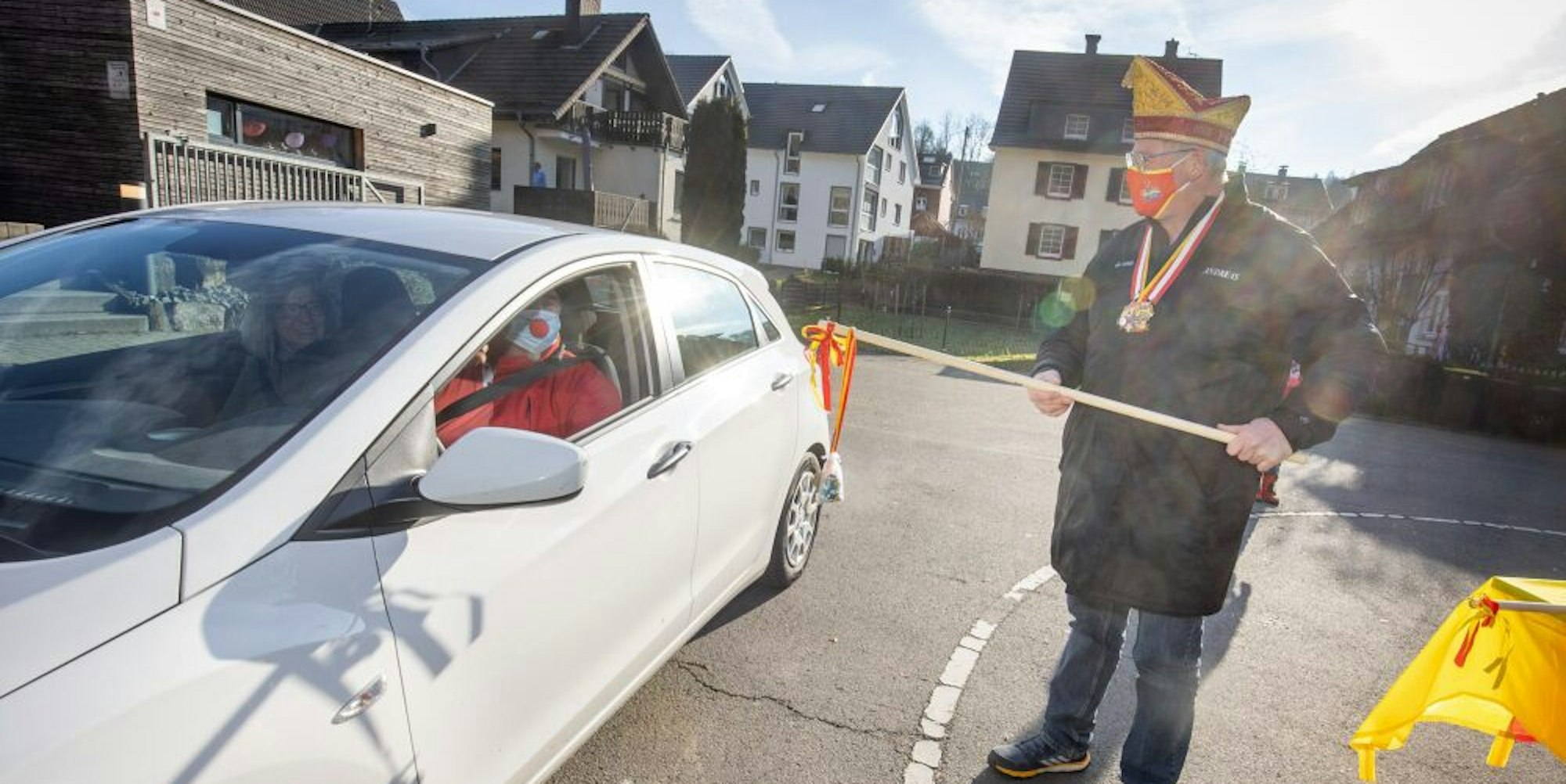 Derweil kommen stetig neue Mitglieder vorgefahren, viele spielen im Autoradio Karnevalsmusik, einige sind kostümiert, wenn auch meist nicht so wild wie das Krümelmonster Oliver Ley. Zwei- und dreimal hingucken müssen die Ordensverleiher ohnehin, hinter der Coronamaske sind die Neuankömmlinge auch unverkleidet schlecht zu erkennen.