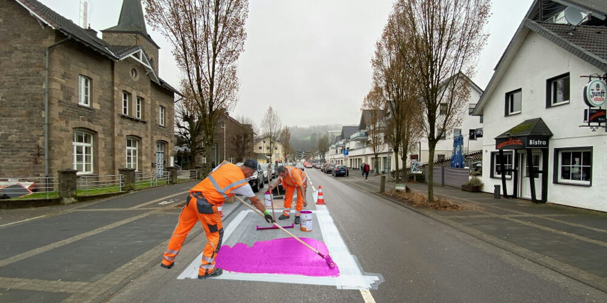 Die Künstler Ulf Aminde aus Berlin und Manuel Gogos aus Bonn errichten mit „Straße der Arbeit“ jenen Arbeitern ein temporäres Denkmal, die aus vielen Ländern ins Oberbergische Land kamen, um gemeinsam die Märkische Straße in Engelskirchen zu bauen und den Ort mit der Welt zu verbinden.