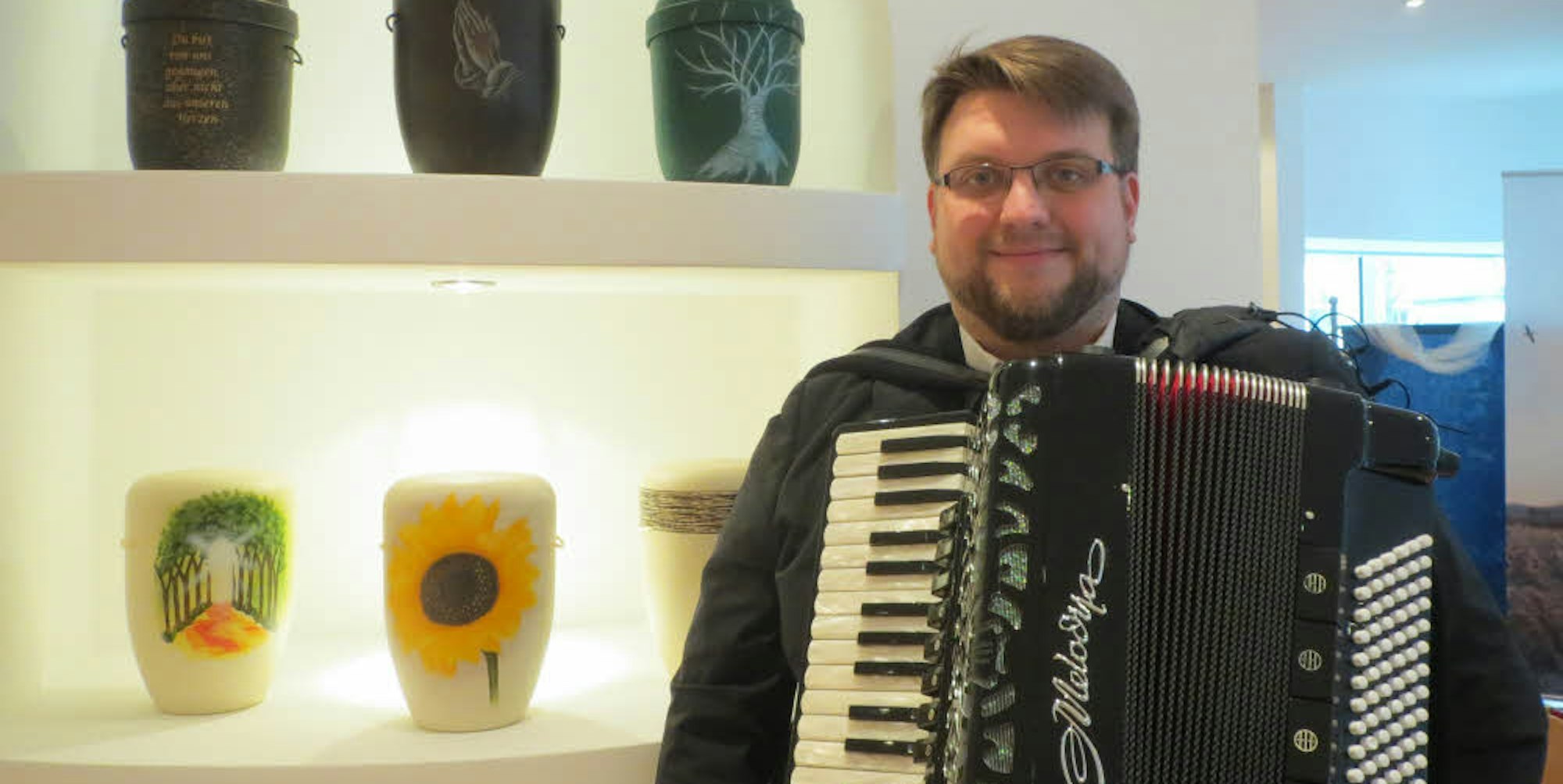 Ründeroth – „Ich bin eine Art Wedding-Planner, nur für traurig.“ So charakterisiert Martin Ahmann seine Tätigkeit als Bestatter. Schon der Blick ins Schaufenster des Ründerother Bestattungshauses, das er zusammen mit Oliver Thierjung führt, ist eine Überraschung: Keine betenden Dürer-Hände – stattdessen ein Saxophon, ein Akkordeon, dazwischen eine farbenfrohe Urne mit Musikinstrumenten, eine zweite, die aus dem Abschnitt eines Baumstamms gefertigt ist. „Ich habe hier meine Berufung gefunden“, sagt der 38-Jährige, den die Ründerother auf dem Martinsmarkt auch als Kölsch-Musiker mit Keyboard und mittlerweile rund 50 Hochzeitspaare im Bergneustädter Heimatmuseum als ehrenamtlichen Standesbeamten erlebt haben. Andere sehen ihn regelmäßig als DJ, der „Trance“ mag.