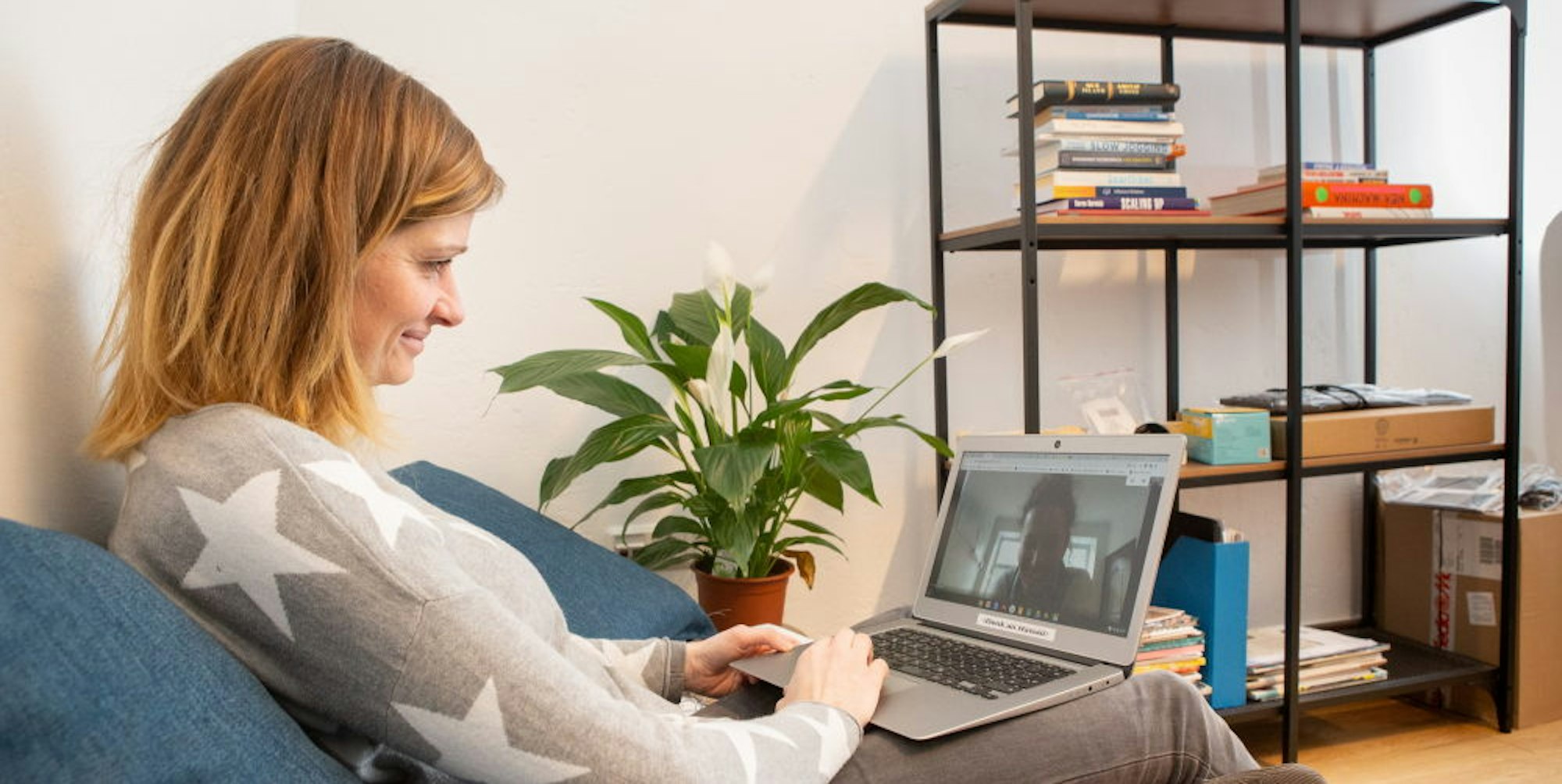 Meeting auf dem Sofa: Sarah Masloch arbeitet seit dem Jahr 2018 bei Wildling Shoes. Um ihren Job von zu Hause aus zu erledigen, benötigt sie im Grunde nur einen Computer und einen Internetzugang.