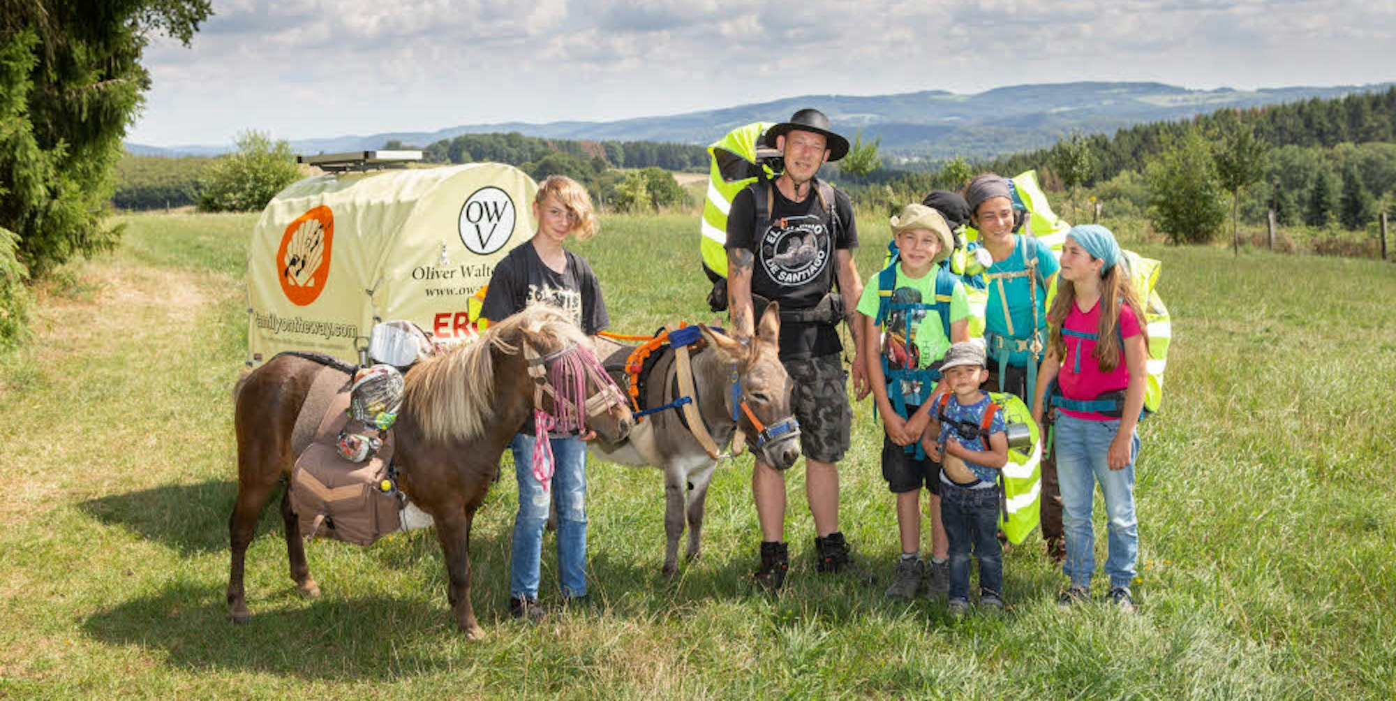 Seit drei Wochen befinden sich Kristin Himmelreich und Matthias Trenkamp mit ihren drei Kindern Ben (11), Leni (10) und Valentin (4) sowie Esel Kalle auf Pilgerreise. Sie laufen den Jakobsweg. Gestartet sind sie in Arnsberg, ihr Ziel: Santiago de Compostela im Nordwesten Spaniens. Ein Jahr haben sie für ihre Pilgerreise eingeplant. Ihr Weg führte sie in den vergangenen Tagen auch durch Marienheide und Lindlar.