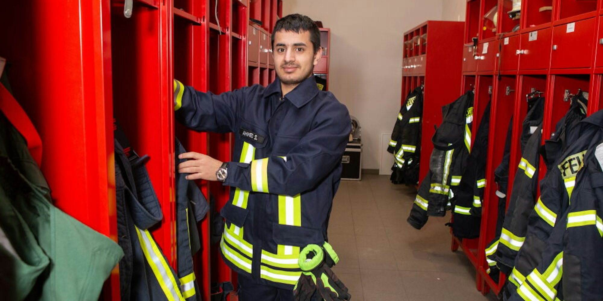 Achmed Salem, damals 18 Jahre alt, engagiert sich bei der Freiwilligen Feuerwehr in Morsbach. Auch heute ist er dort aktiv, nimmt an Fortbildungen teil, hat seinen Atemschutzlehrgang absolviert und inzwischen auch an Einsätzen teilgenommen.
