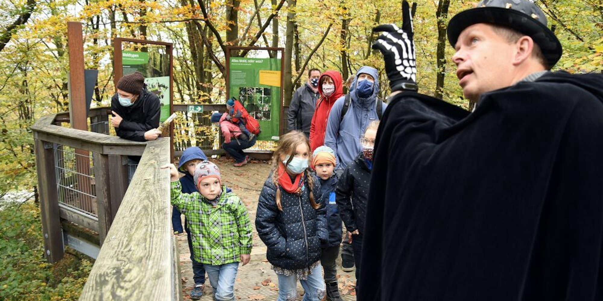 „Die Kinder sollen sich gruseln, aber nicht ängstigen“, betont Mielke, der sich im vergangenen Jahr erstmals solche Rundgänge ausgedacht hat. Da hatte sich Panarbora vor Halloween in einen Geisterpark verwandelt. Weil 2020 aber alles anders ist, gibt es diesmal nur die rund anderthalbstündigen Touren. „Wir hoffen in dieser schweren Zeit auf etwas andere Unterhaltung“, sagt etwa Thomas Bein aus Berlin, der mit Tochter Jule (8) unterwegs ist. 1635 Meter Baumwipfelpfad und schaurig-schöne, skurrile, fantastische und auch ein wenig makabere Geschichten liegen vor Vater und Tochter. Die vom bösen Stinkevogel ist nur eine davon.