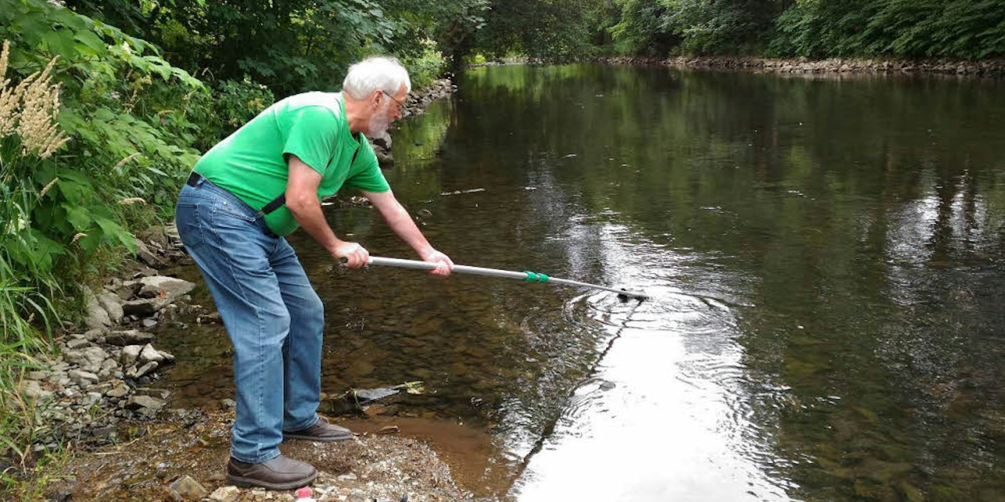 Der BUND hat Gewässer auf multiresistente Keime hin untersuchen lassen. Paul Kröfges nahm auch Proben aus der Agger.