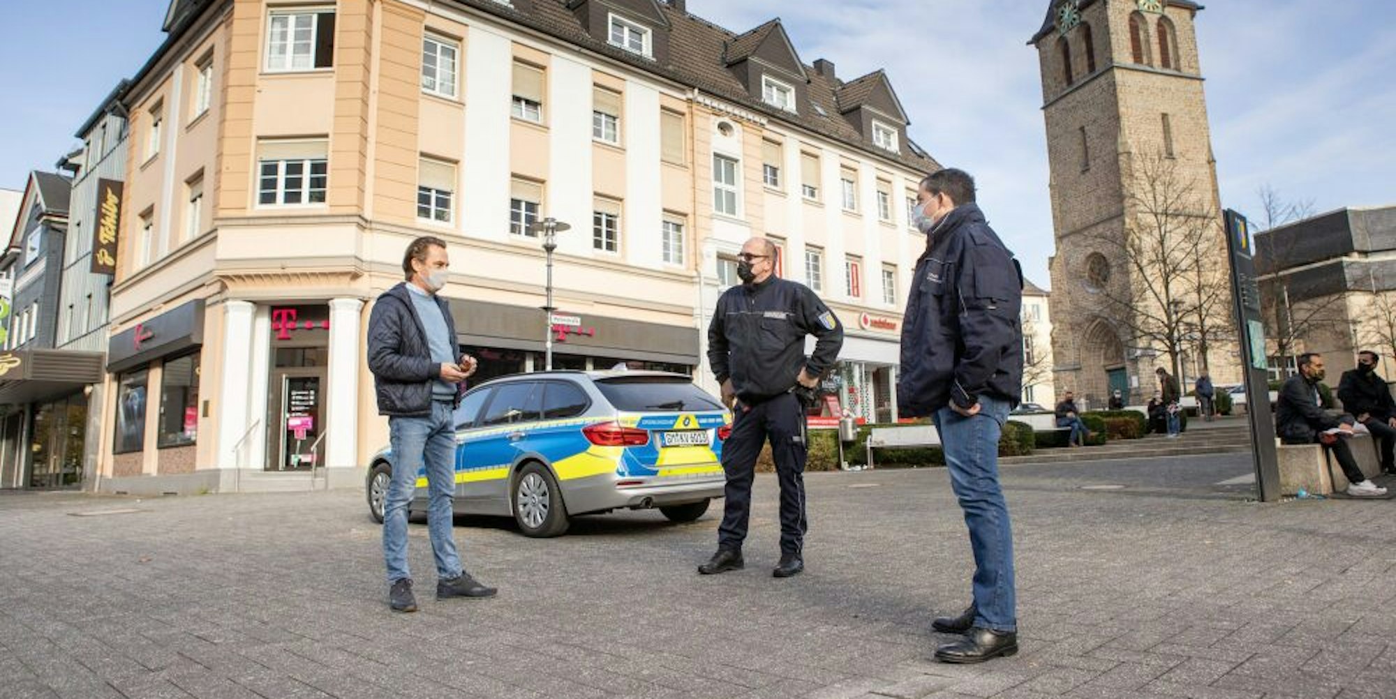 Mit Abstand nutzt Guido Richardt die Gelegenheit, um Oliver Orth und Frank Helmenstein vom Gummersbacher Ordnungsamt nach der Maskenpflicht zu fragen.