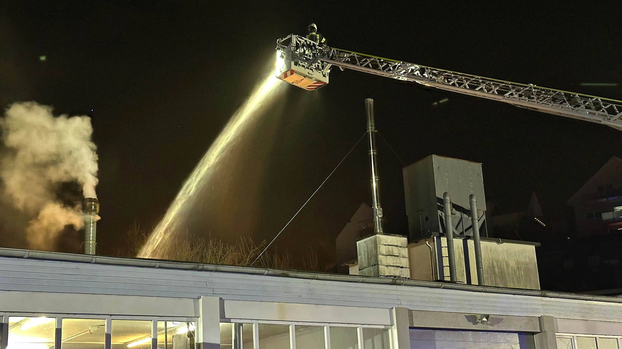 Auch von der Drehleiter aus ging die Feuerwehr gegen die Flammen vor.