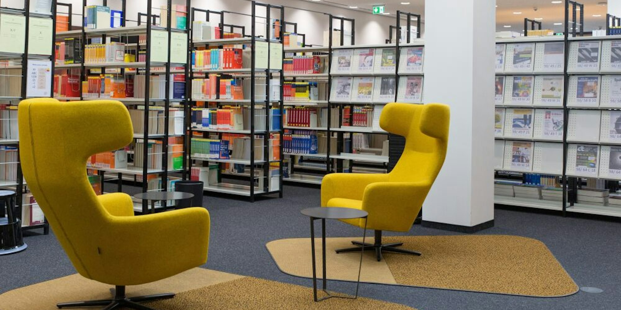 Gelb leuchtet die Lese-Insel in der Mitte der Bibliothek.