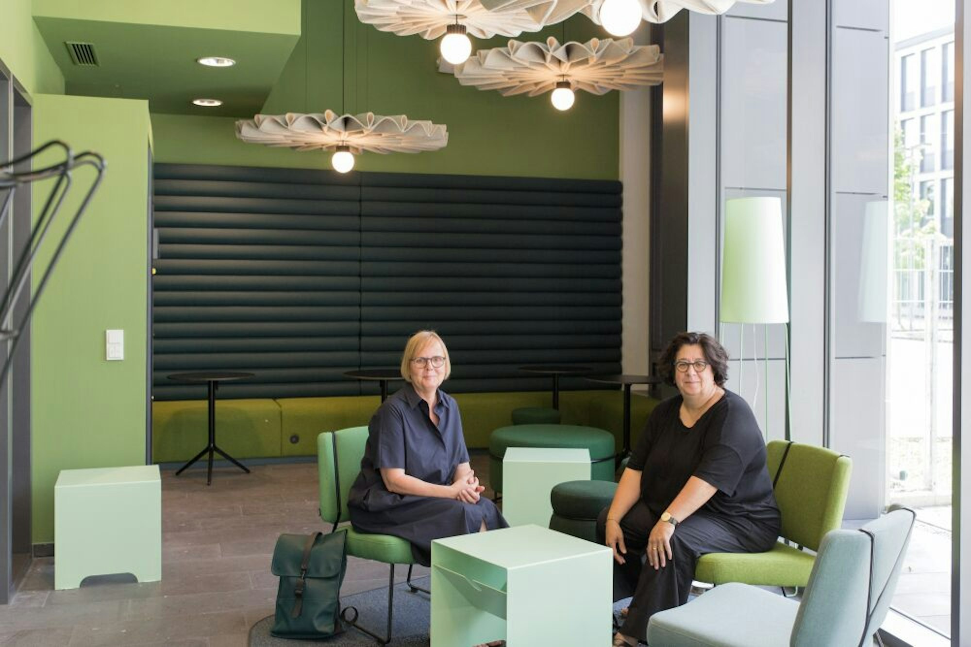 Das hören die Schöpferinnen gerne. Sie haben zudem darauf geachtet, dass alles barrierefrei ist und sich Menschen mit Handicap jeden der Arbeitsplätze einrichten können: Auf Knopfdruck verändern etwa Schreibtische ihre Höhe, ebenso wandelbar ist der Empfangstresen. Sabine Altrogge: „Jedes Detail davon stammt aus unserem Büro.“