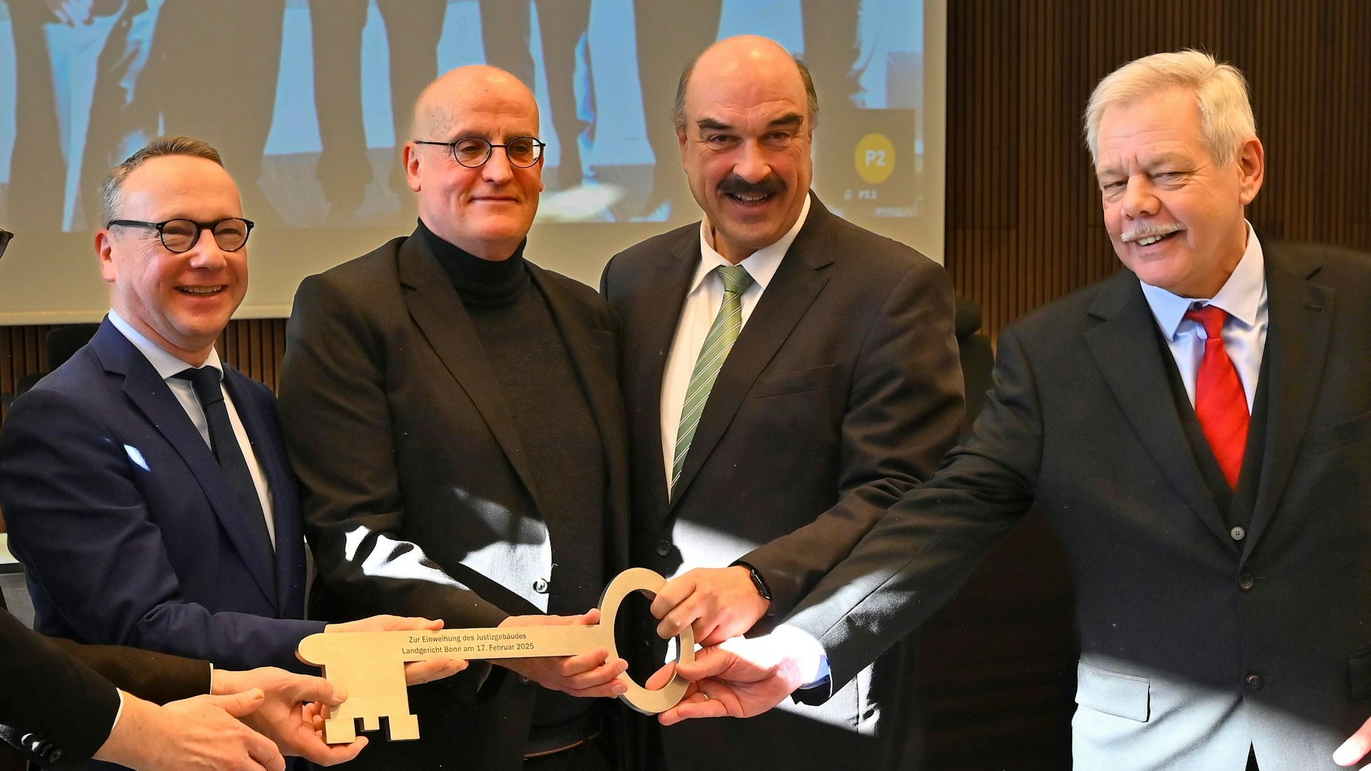 Den symbolischen Schlüssel halten (v.r.) Architekt Josef Rotthoff, OLG-Präsident Bernd Scheiff, Volker Müller (GWG) und Justizminister Benjamin Limbach bei der Einweihungsfeier in Siegburg.