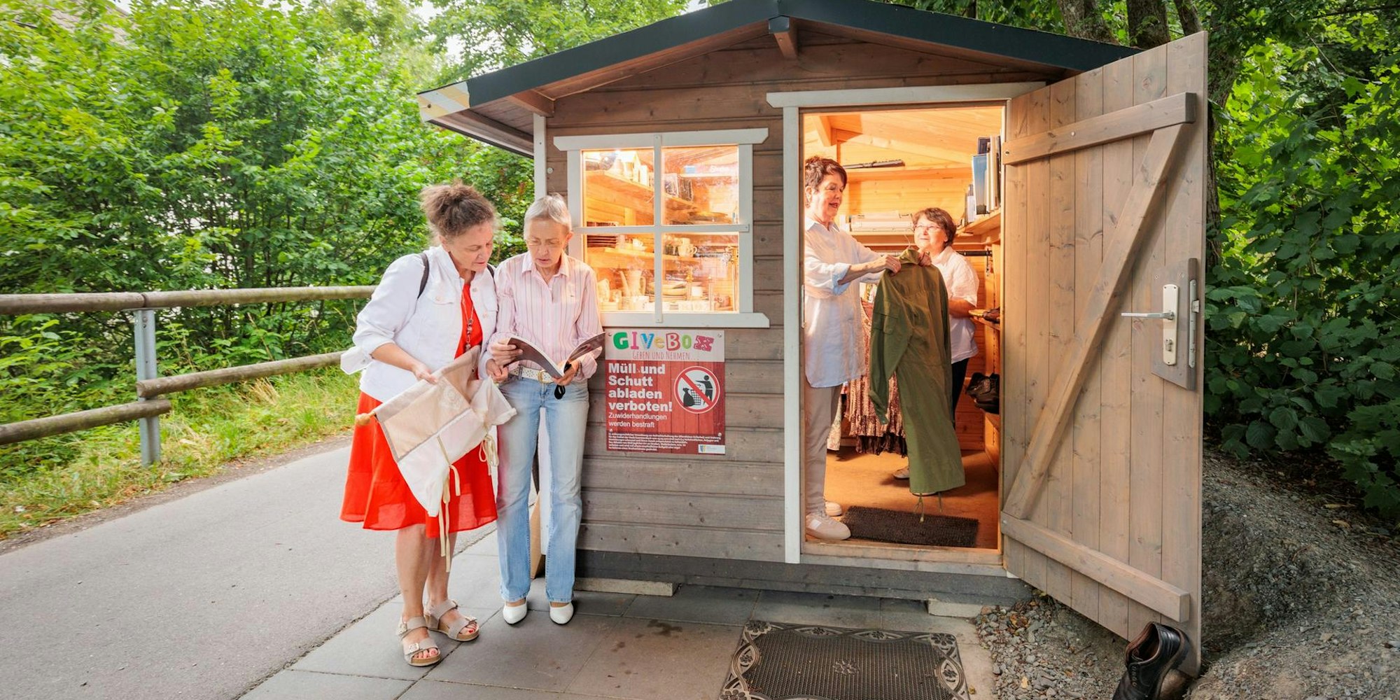 Derschlag – In Derschlag heißt die Give-Box nur noch „unser Büdchen“. Seit der Eröffnung Ende September 2019 hat sich das kleine Häuschen am Alleenradweg, unmittelbar vor der Eckenhagener Straße, zu einem beliebten Treffpunkt entwickelt. Schöne Begegnungen, ein kleiner Plausch oder eine Pause bei der Radtour verbinden sich dort mit dem Austausch netter Kleinigkeiten, von Kleidung, Büchern oder Schuhen. Das Prinzip der Give-Box entspricht dem der Offenen Bücherschränke: Nimm etwas, gib etwas und behandele die Give-Box pfleglich.