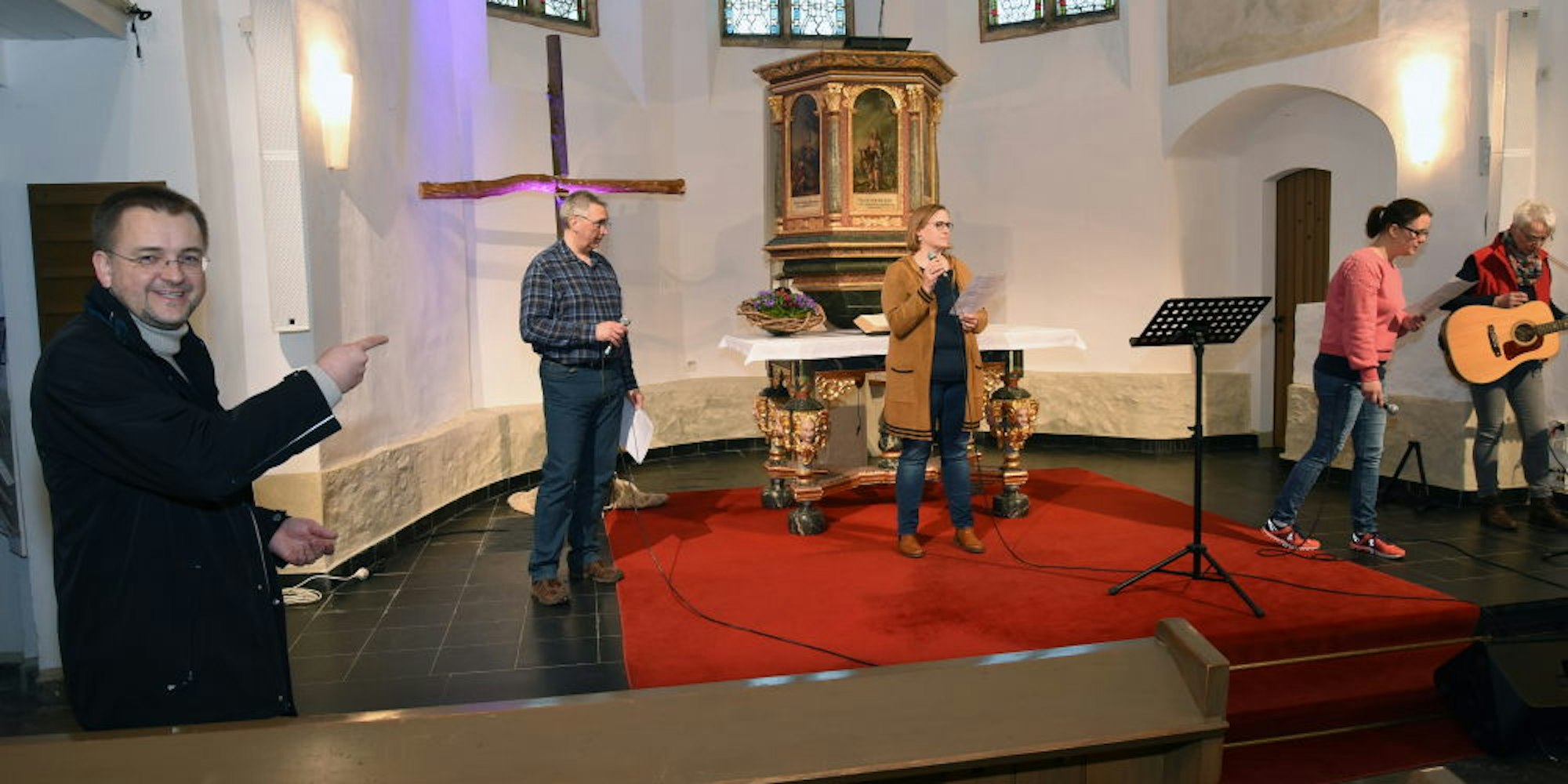 Es war ein mehr als ungewohntes Bild: Die Pfarrer mussten vor leeren Kirchenbänken predigen – ohne die für alle Redner so wichtige Reaktion in den Gesichtern ihrer Zuhörer mitzubekommen. In Nümbrecht hatte Matthias Köhler, der sonntags sonst vor 200 Leuten predigt, immerhin die fünf Mitglieder des Musikteams im Kirchenschiff verteilt – alle in Corona-gebührlichem Abstand – so dass er wenigstens ein bisschen Publikum hatte, denn , so sagt er: „Die Predigt ist ja der stärkste Dialog mit der Gemeinde.“ Den auf die Bildschirme zuhause zu bringen, ist eine besondere Herausforderung.