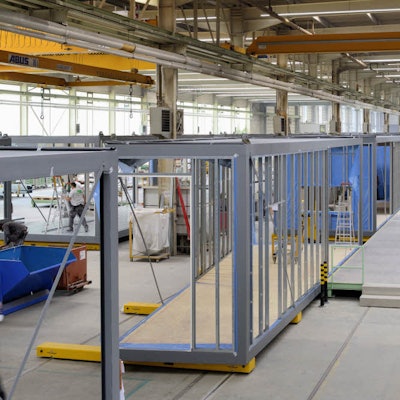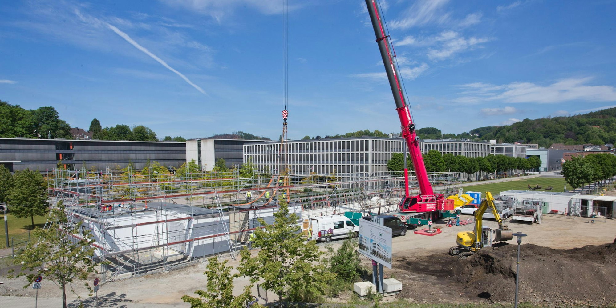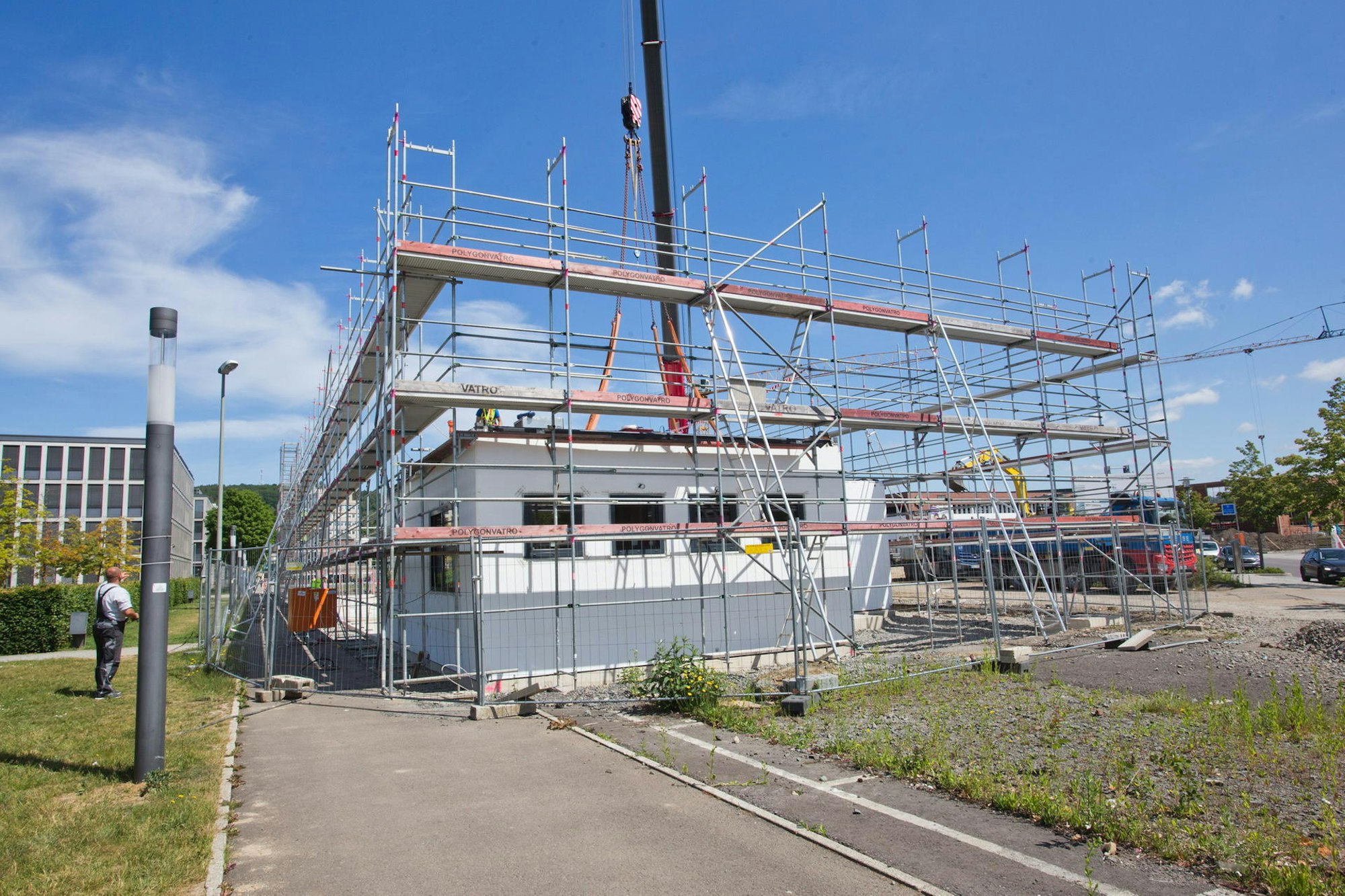 Modul für Modul werden die 72 Teile des Gebäudes auf dem Steinmüllergelände angeliefert und zusammengesetzt.