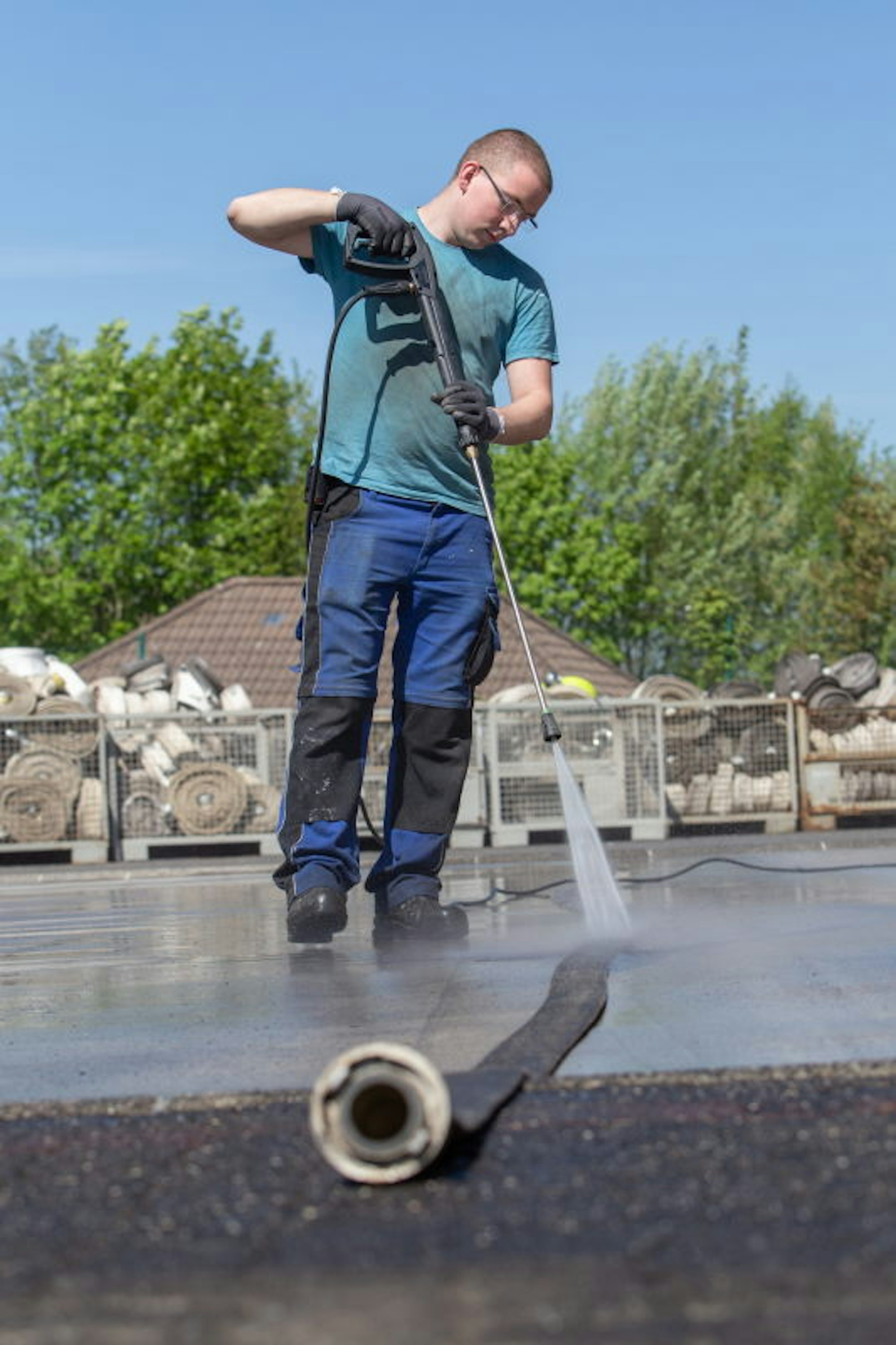 Die annähernd zehn Kilometer Schlauch müssen nun gereinigt werden. Das passiert mit der Schlauchreinigungsmaschine im Notfallzentrum in Marienheide-Kotthauserhöhe. Viele der eigentlich fast weißen Schläuche sind von Ruß und Asche schwarz verfärbt. Anders als bei der regulären Reinigung, bei der die Schläuche vor dem Waschen in einer Reinigungslösung einweichen, werden sie nun mit einem Hochdruckreiniger vorgereinigt und dabei gleich nach den Kommunen sortiert, an welche die Schläuche später zurückgehen.