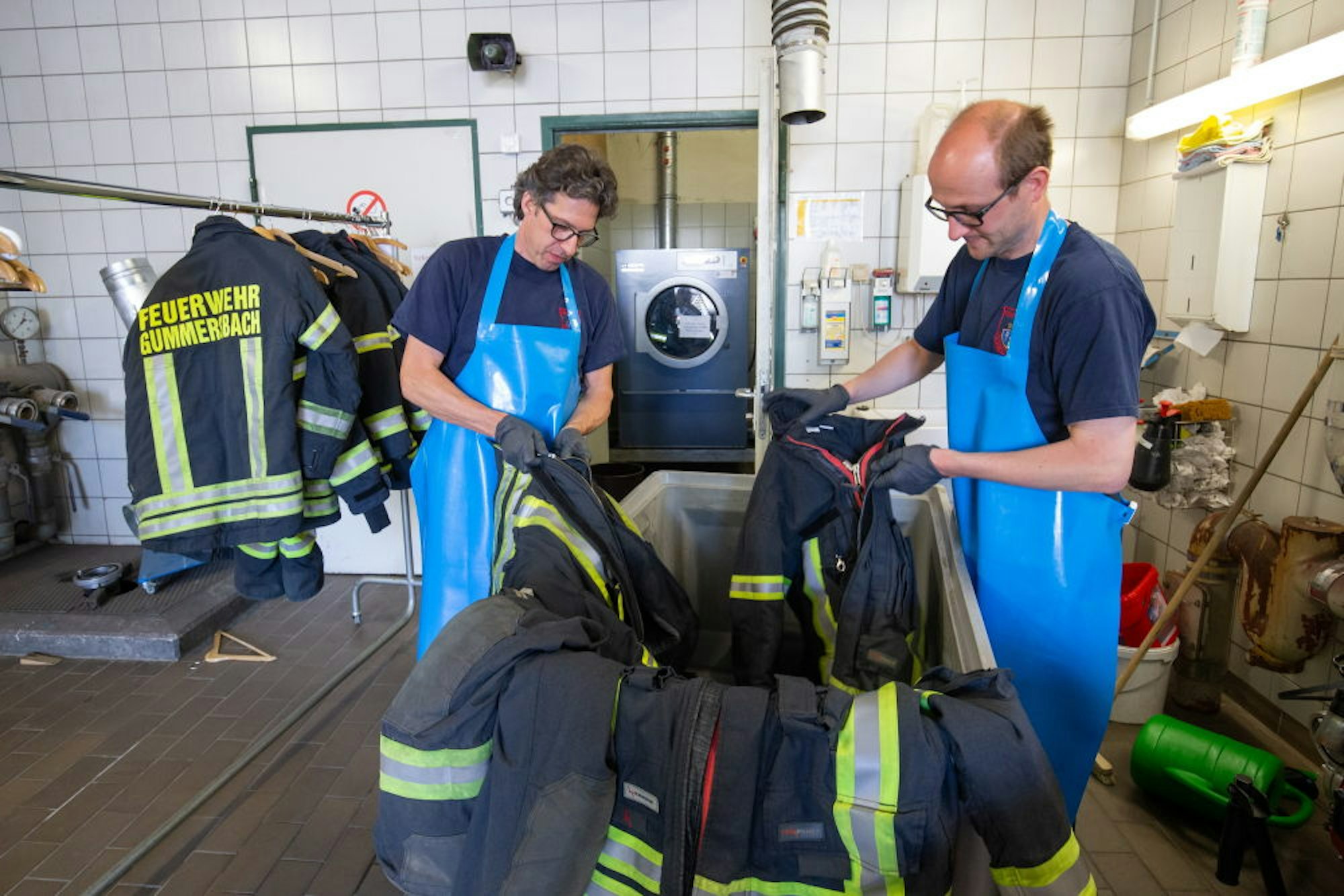 Frank Feldmann und André Wortmann von der Feuerwache Gummersbach sind dagegen noch länger mit den Folgen des Einsatzes beschäftigt. Sie erledigen die Reinigung und das Trocknen von rund 200 benutzten Einsatzgarnituren der Gummersbacher und einiger umliegender Feuerwehren. „Wir waschen seit einer Woche den ganzen Tag“, erzählt Feldmann. „Wenn alles gut läuft, sind wir mit den letzten Sachen in etwa zwei Wochen fertig.“