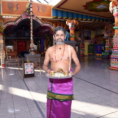 Die kleine Gemeinde zieht von Schrein zu Schrein, begleitet vom Duft von Räucherwerk und Klängen aus der Musikanlage. Jeder Gott, jede Göttin ist blumengeschmückt, manche mit Lichterketten bekränzt. Zum Abschluss bekommen alle Gläubigen vom Priester rituelle Gaben, unter anderem heilige Asche, Milch, Sandelholz und ein rotes Bindi auf die Stirn. Inzwischen wurden vor Ganeshas Schrein Teller aufgestellt mit Blumen und einer kleinen, aus Kurkuma und Wasser geformten Figur des Gottes.