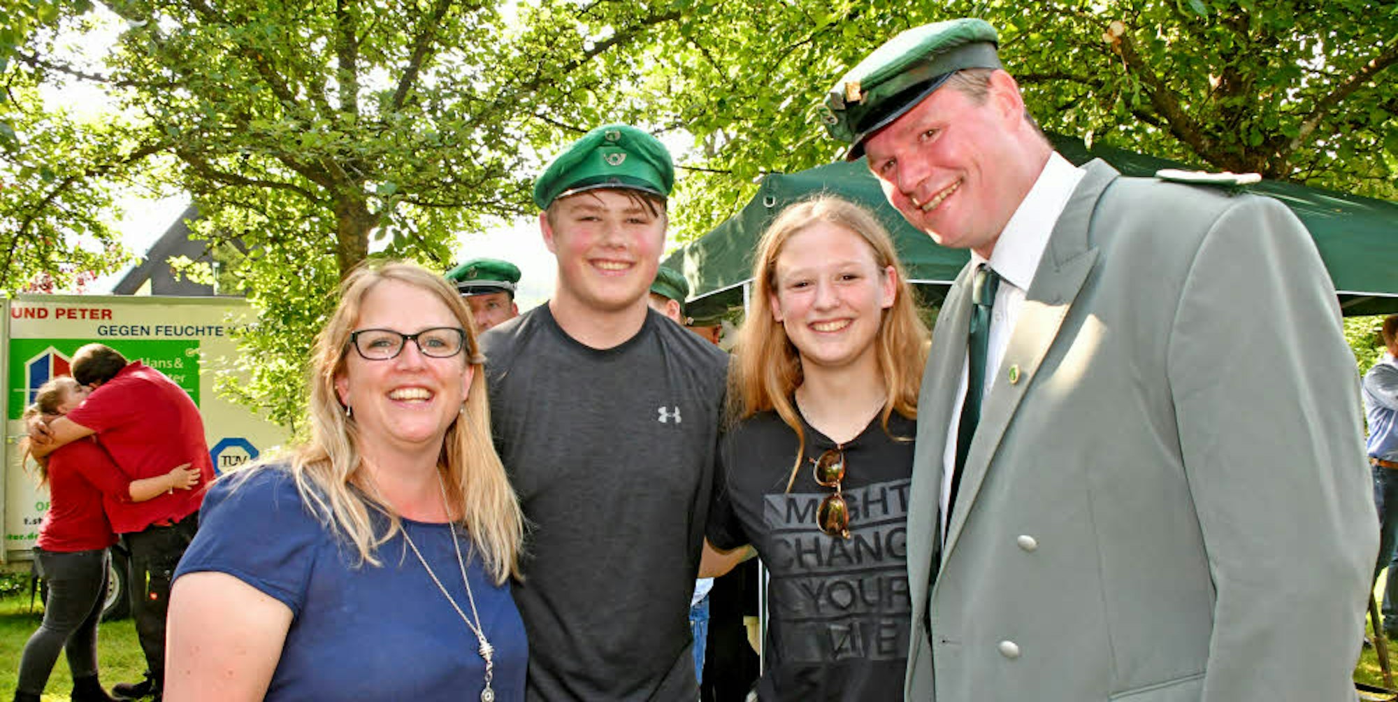 Markus Brand mit Ehefrau Inka und seinen Kindern Lukas und Emely freut sich, dass er den Gummersbacher Königsvogel erlegt hat.