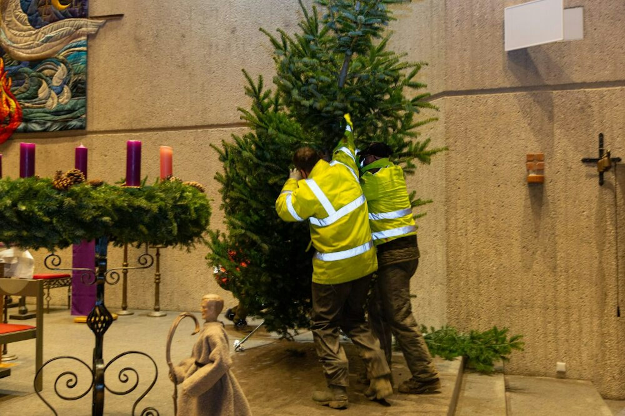 Während am Freitagabend in der Krisensitzung von Pastoralteam, Verwaltungsleitungen und Folgediensten noch um die schwere Entscheidung gerungen wird, laden die Helfer vor dem Kirchentor zwei große Tannen ab, die am Morgen in der Weihnachtsbaumschonung von Karsten Eicker in Gummeroth geschlagen wurden. Seit vielen Jahren liefert die Weihnachtsbäume für St. Franziskus. „Eine nackte Kirche zu Weihnachten, das geht gar nicht!“, sagt Küster Bonnacker. Und so wird geschmückt – trotz allem.