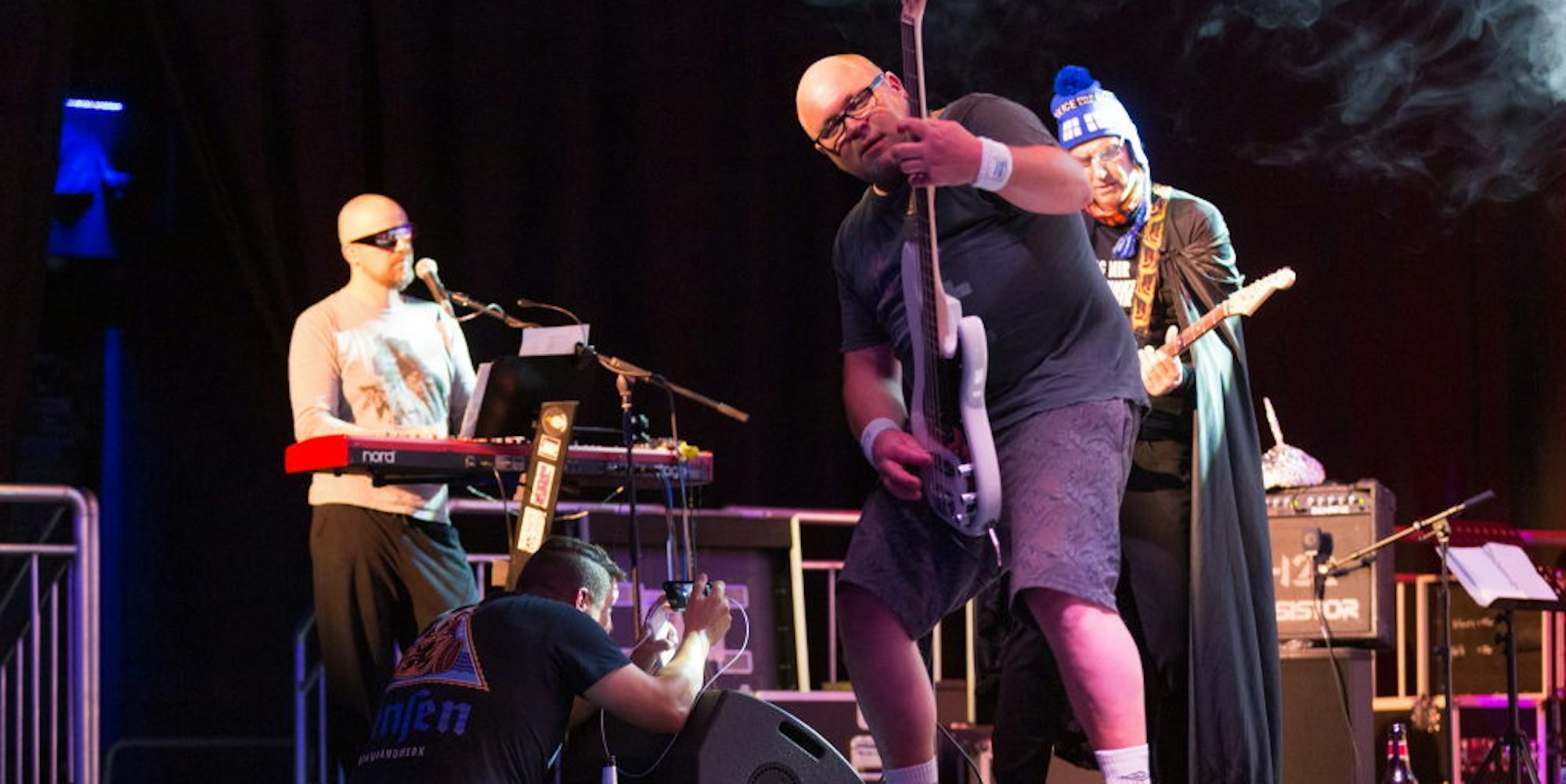 Fünf stationäre und mobile Kameras fangen die Bühnenatmosphäre ein, übertragen direkt ins Internet, auf den bandeigenen YouTube-Kanal. Und dann geht es los. Unter Jubel vom Band positionieren sich die in bunte OP-Hauben gehüllten Musiker auf der Bühne. Den Konzertauftakt macht „Wolle“ an seiner E-Gitarre mit der Eurovisionshymne. Der Schluck des Lead-Sängers Stefan Günther aus der Pulle, wie er sich für ordentliche Rocker gehört, wirkt in diesem Moment episch, als sei die lange Corona-bedingte Durststrecke ohne Auftritte endlich vorüber. Anderthalb Stunden lang wird die Band die Show sichtlich auskosten.