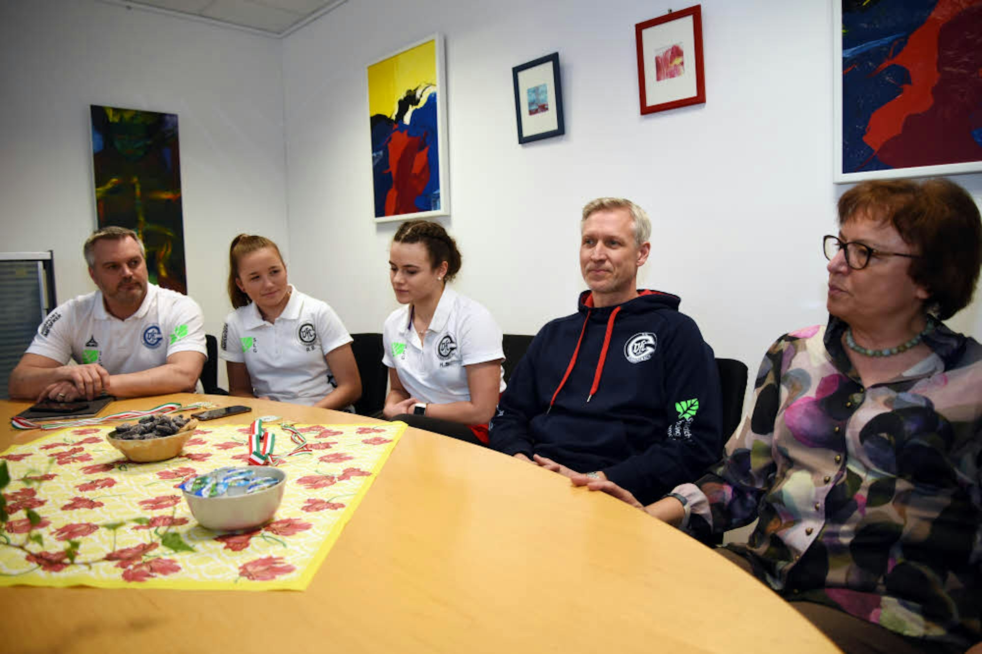 Im Interview (v.r.) Schulleiterin Beatrix Will, Lehrer Oliver Sterzik, die Handballerinnen Hannah Stöcker und Ronja Breuer sowie Vereinstrainer Erik Schoppmann.