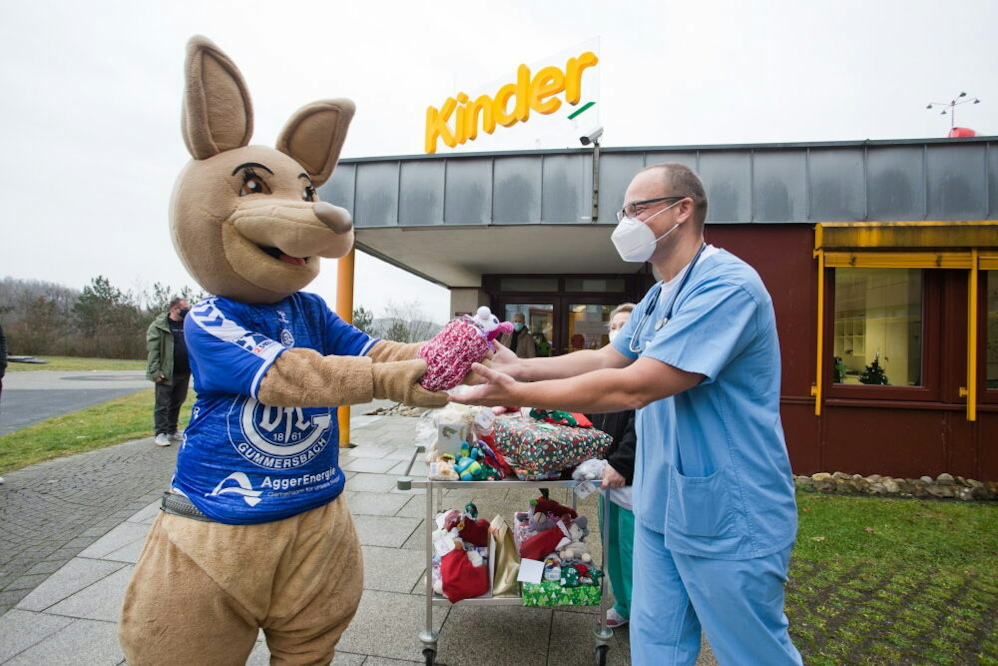 Gummersbach – Dr. Roland Adelmann, Chefarzt der Gummersbacher Kinderklinik, bereitet in Behandlungsraum Fünf alles für einen ganz besonderen Corona-Test vor. Der Patient, der am Montag vor ihm sitzt, ist wesentlich größer als es die Klienten sonst sind. Ein größeres Teststäbchen muss her. VfL-Maskottchen Gummi hat sich auf den Weg zur Kinderklinik gemacht, um die vielen Geschenke, die die Fans des Handballvereins auch in diesem Jahr wieder für die Kinder gespendet haben, zu den kleinen Patienten zu bringen.
