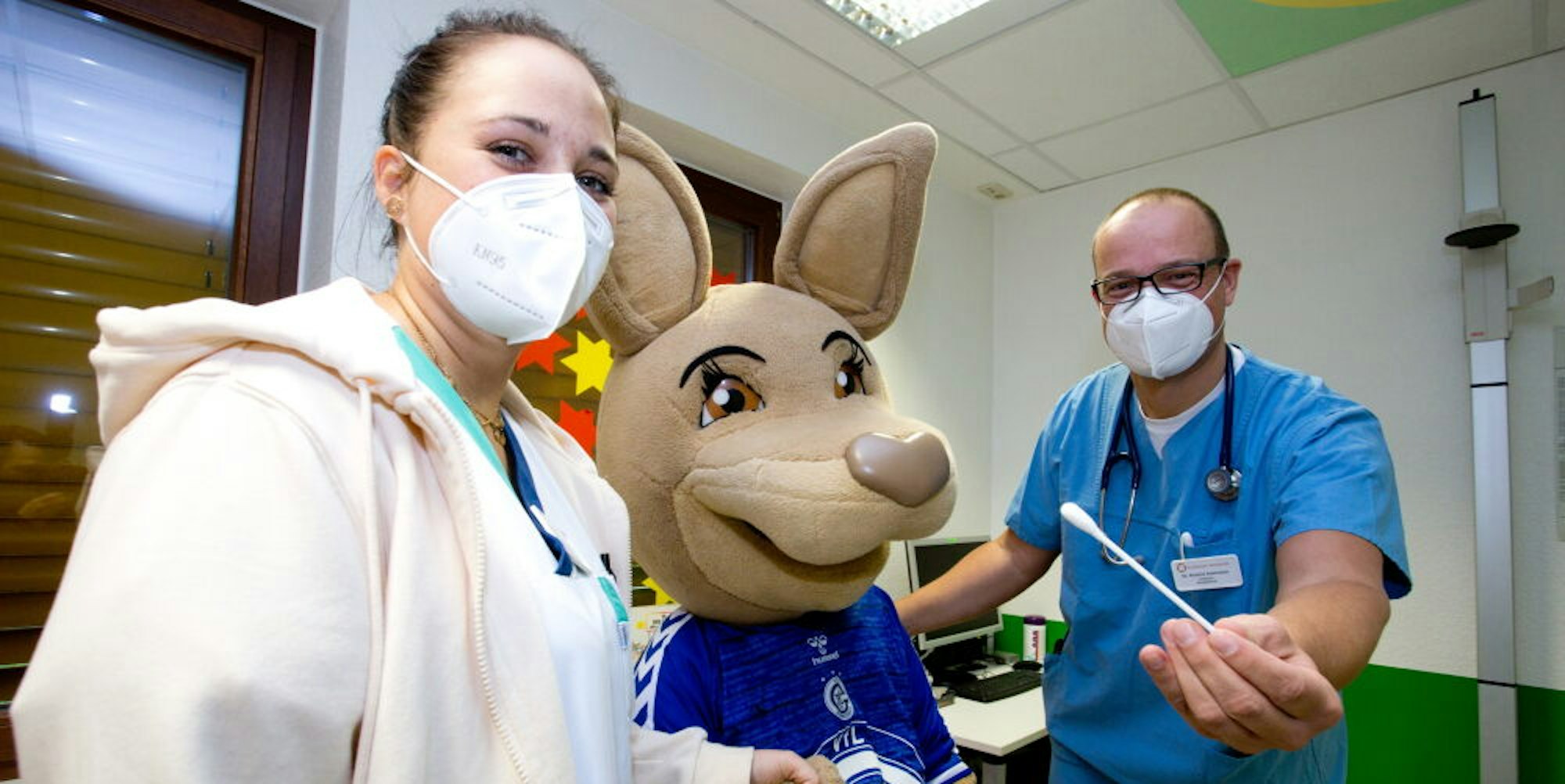 Vor der Geschenkübergabe testete Dr. Roland Adelmann, Chefarzt der Kinderklinik in Gummersbach, das VfL-Maskottchen Gummi auf Corona – natürlich im Känguru-Behandlungszimmer 5.