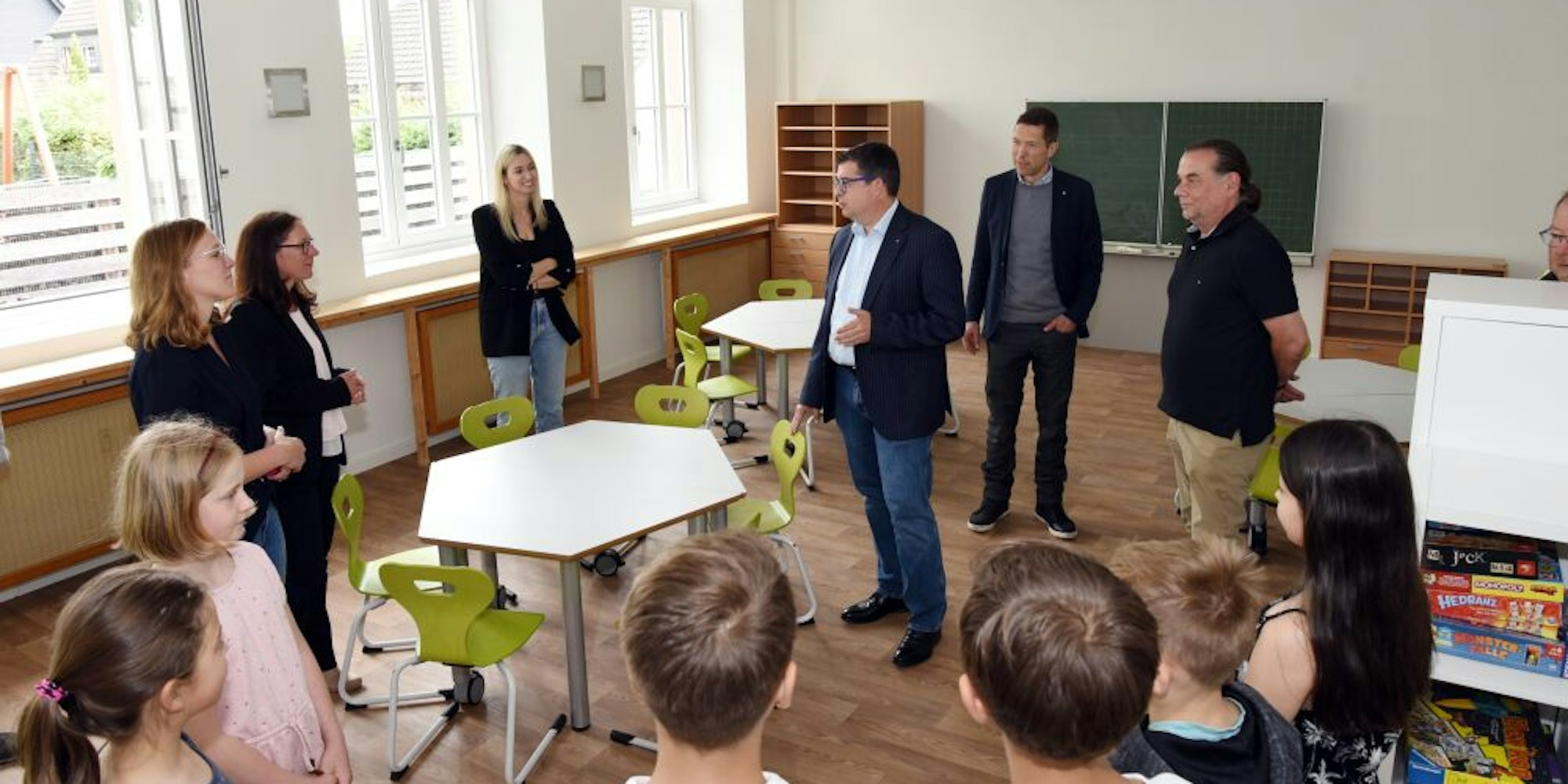 Gummersbach-Niederseßmar – Nach den Grundschulen in Windhagen sowie an der Körnerstraße hat nun auch die GGS in Gummersbach-Niederseßmar neue Räume für ihren Offenen Ganztag bekommen und am Freitag vorgestellt. Schulleiterin Nina Odrowski begrüßte vor dem ehemaligen Grundschulgebäude die kleine Gästerunde, darunter Bürgermeister Frank Helmenstein und den für die Schulen zuständigen Ersten Beigeordneten Raoul Halding-Hoppenheit. Der bedankte sich bei Achim Zielenbach dafür, der Stadt die Räume der ehemaligen Grundschule vermietet zu haben.