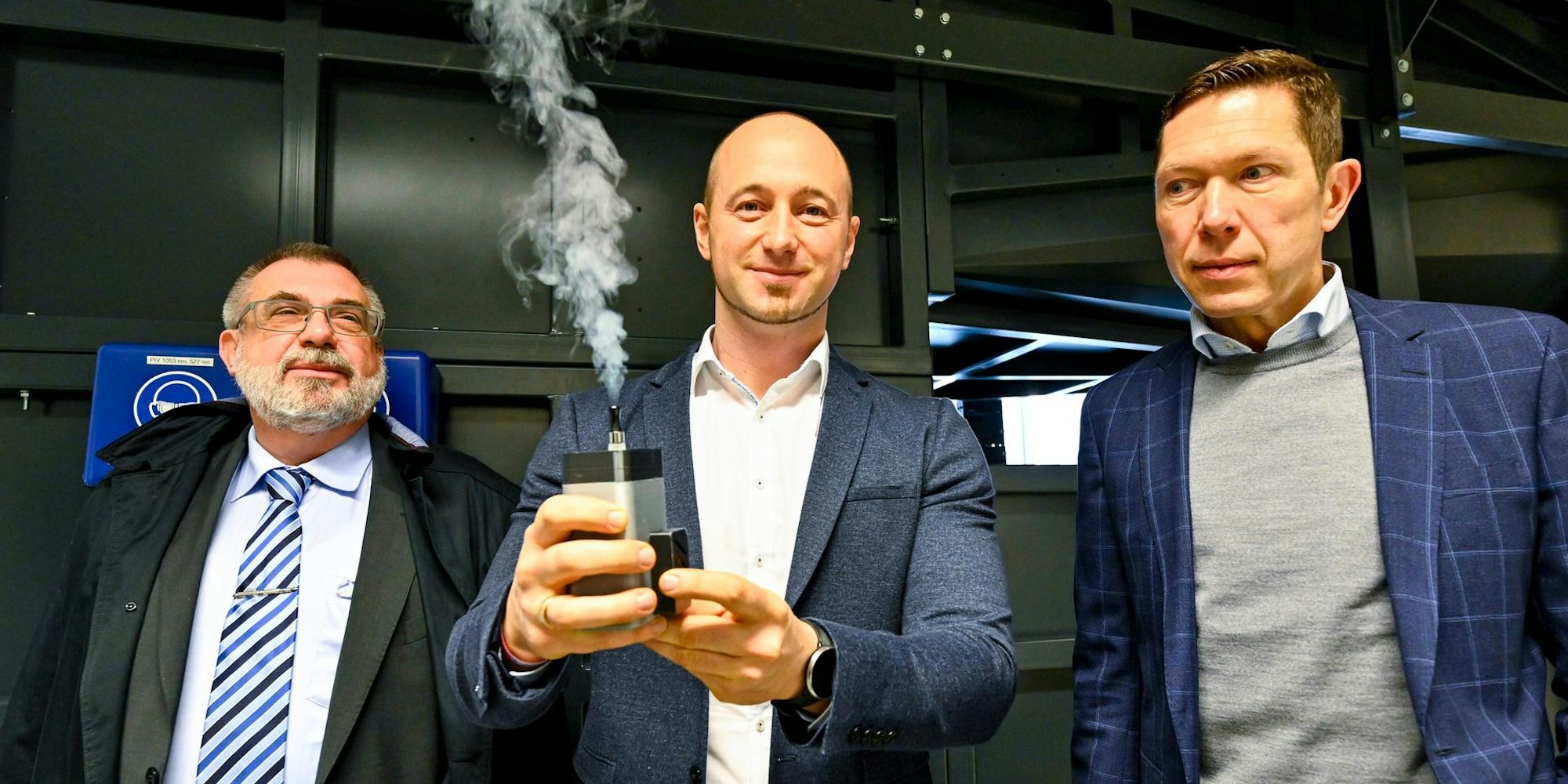 Nebel wurde auch beim Test der zur Auswahl stehenden Luftfilter eingesetzt. Am Verfahren beteiligt waren (v.l.) Prof. Dr. Horst Weißsieker, Prof. Dr. Ing. Denis Anders, Raoul Halding-Hoppenheit.