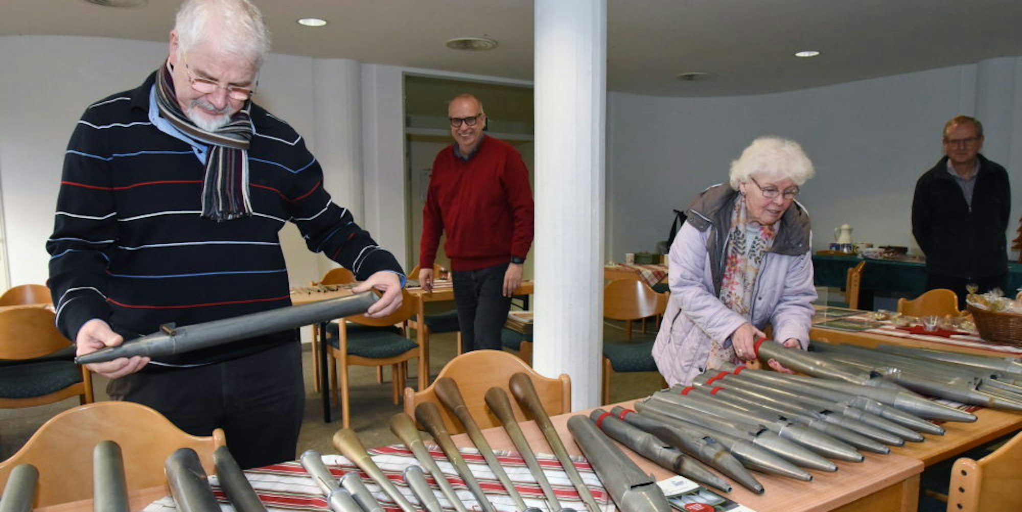 Gummersbach – Gerade erst gab’s „Back-Pfeifen“ aus Teig, jetzt sogar echte aus der bei einem Brandanschlag im November 2018 stark beschädigten Orgel: Im Franziskus-Treff unterhalb der Kirche wurde am Sonntag das Gros der 250 Orgelpfeifen zum Kauf angeboten, die bei dem Feuer nicht oder nicht völlig zerstört worden sind und trotzdem bei der Reparatur der Orgel keine Verwendung finden können. Norbert Haas, Rita Sackmann Klaus Korsten und Wolfgang Gerth hatten „Verkaufs-Dienst“.