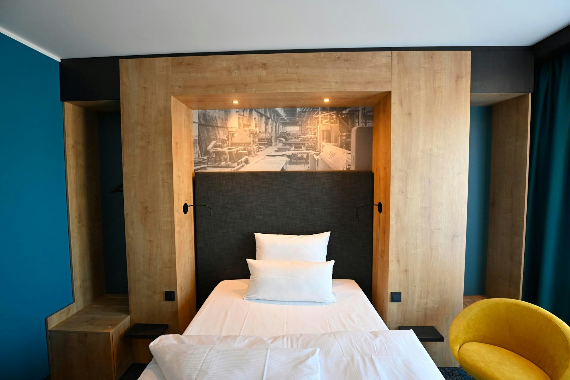 Dabei ist Steinmüller nicht nur Name des Hotels auf dem gleichnamigen Gelände. Die Erinnerung an den einst größten Arbeitgeber der Stadt geht auch drinnen weiter. So heißen die beiden Veranstaltungsräume „Kesselhaus“ und „Alte Gießerei“. In den Gästezimmern sind zudem historische Schwarz-Weiß-Bilder von Steinmüller aufgehängt.