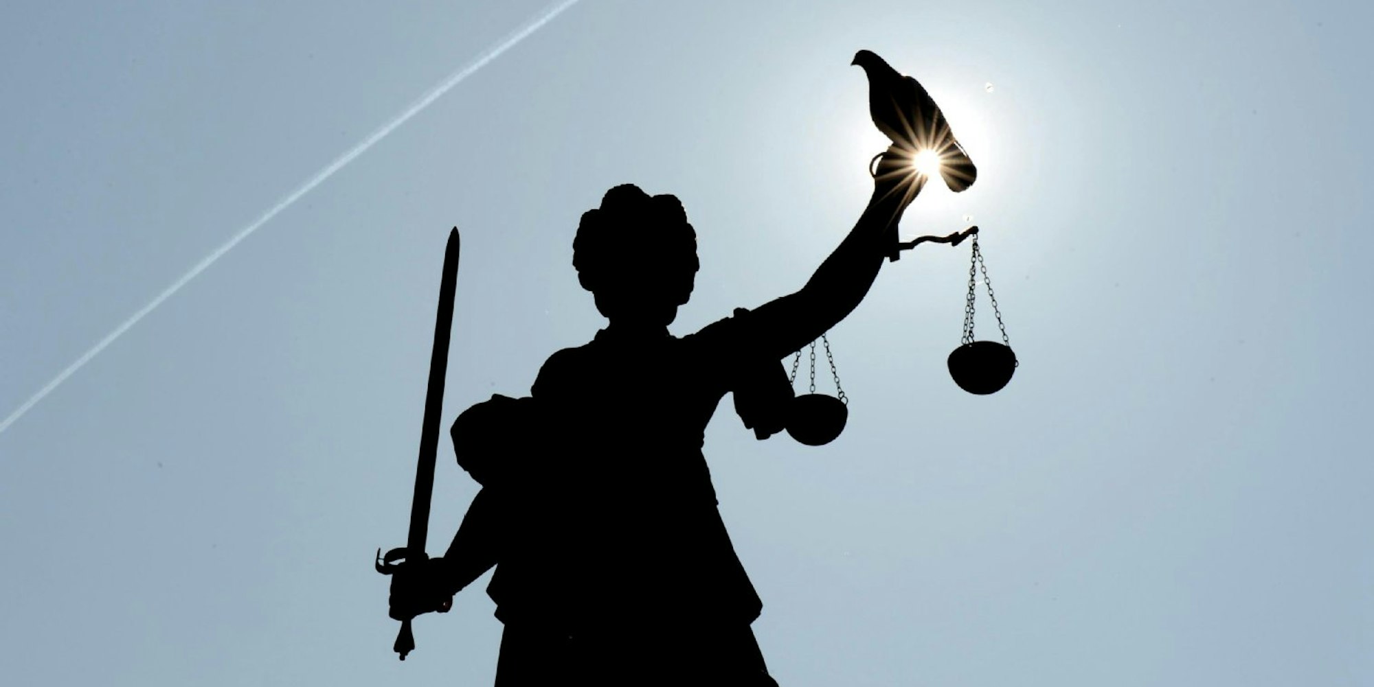Eine Taube sitzt auf einer Justitia (Symbolbild)