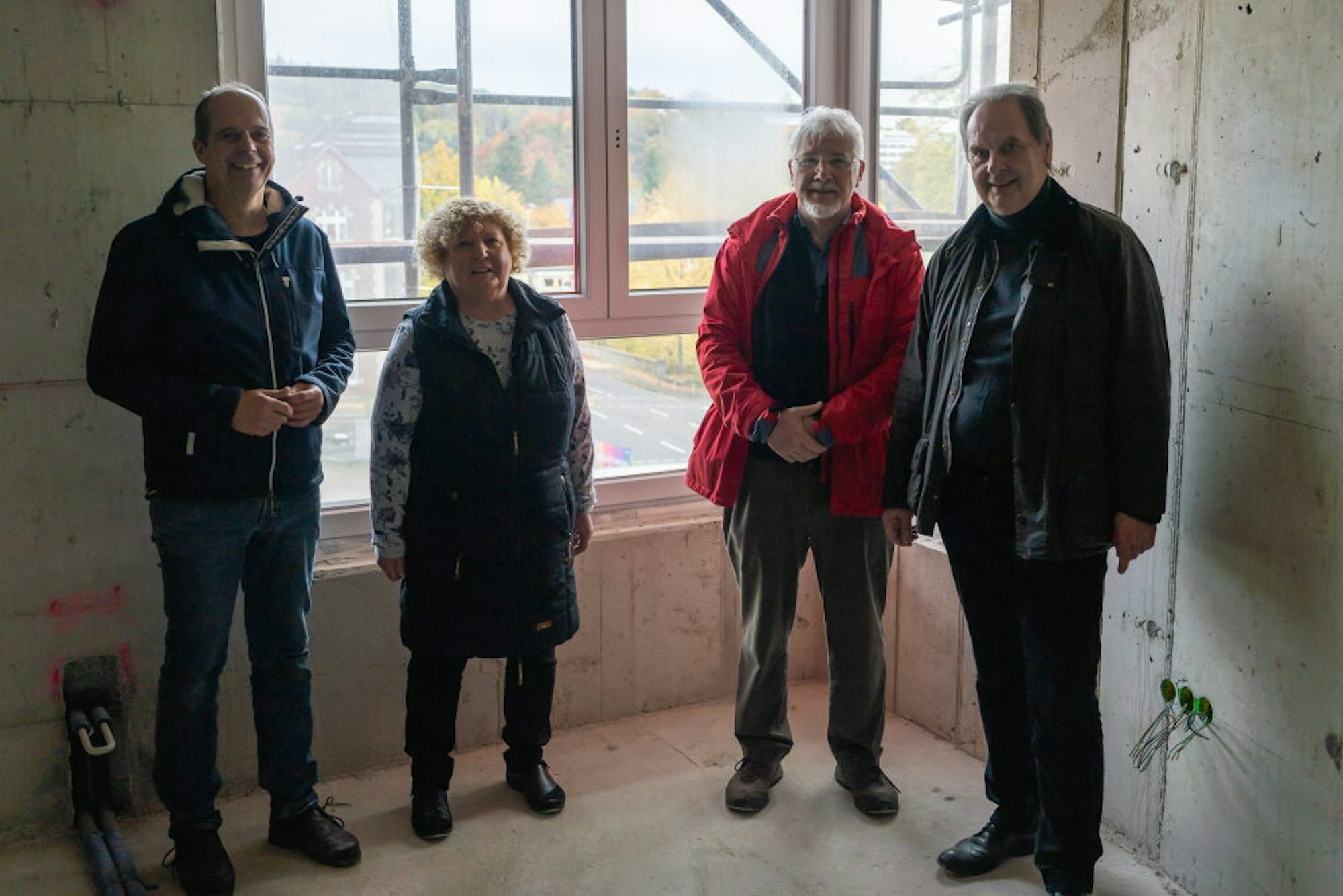 Am Sonntag haben Caritas-Chef Peter Rothausen (v.r.), Vermesser Norbert Haas, Pflegedienstleiterin Angelika Grossmann und Architekt Axel Töpfer das Projekt bei einem Baustellenfest vorgestellt.