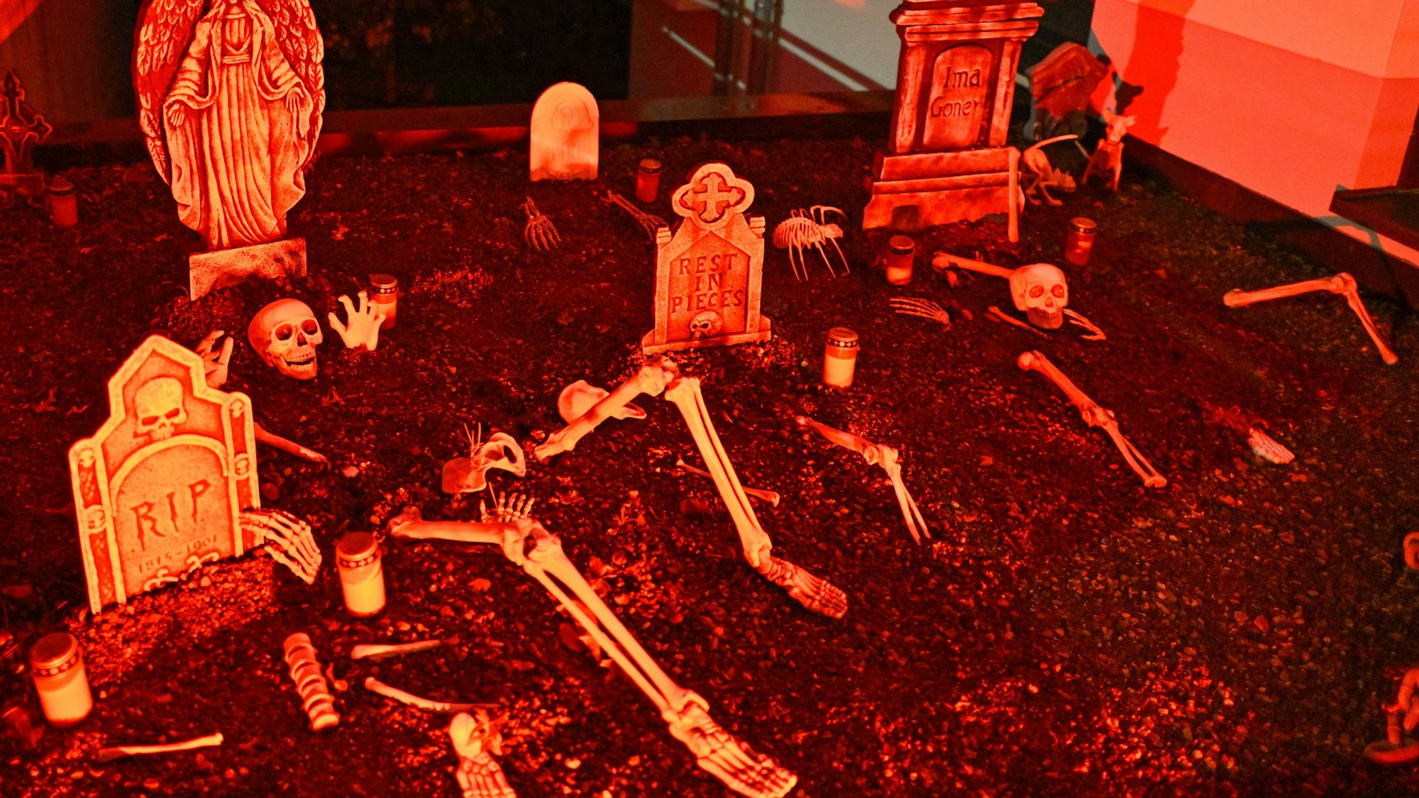 Starke Nerven brauchen die Nachbarn des rot leuchtenden Spukhauses, vor dem ein Riesenskelett wacht.