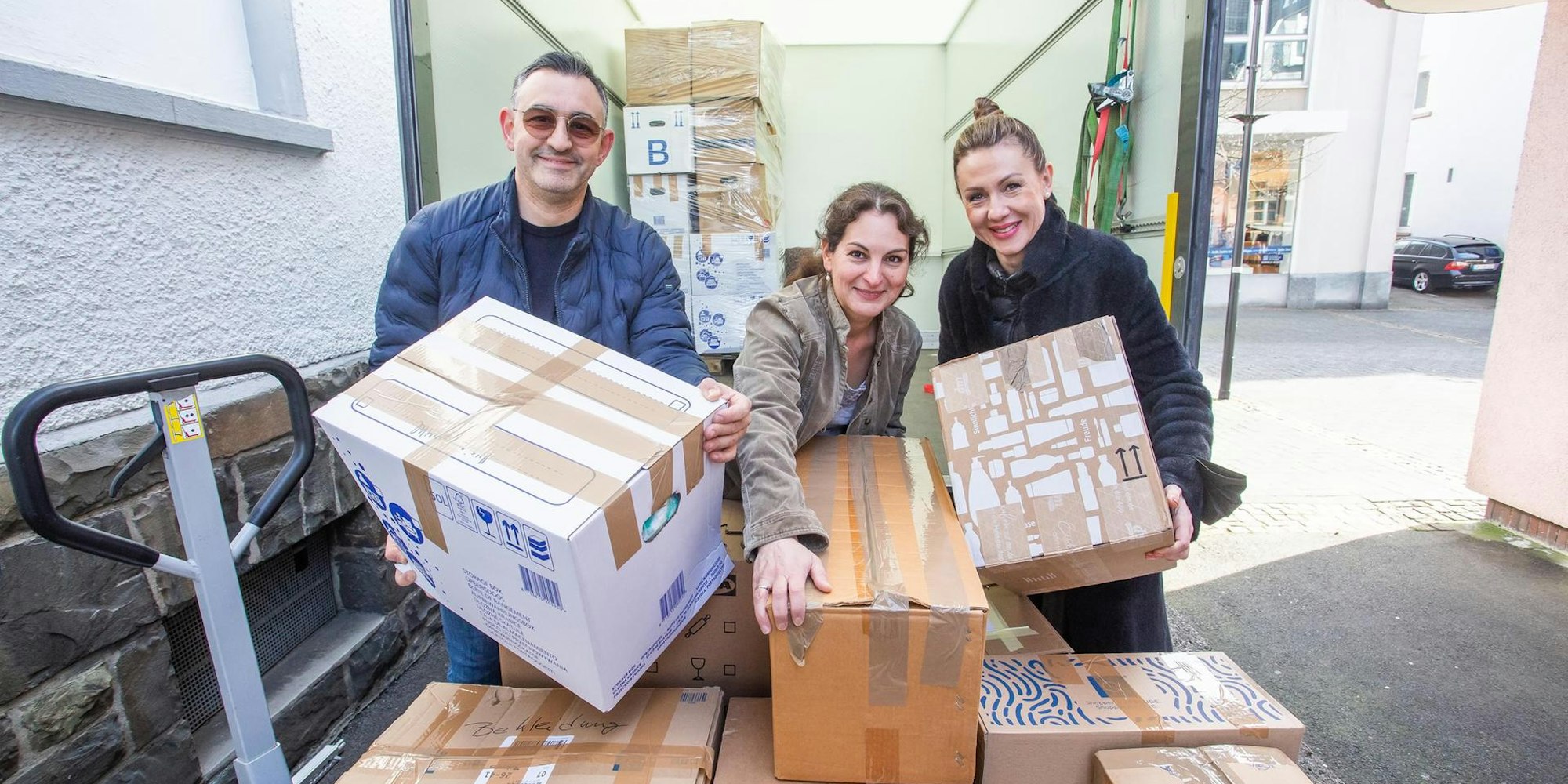 Bei Giuseppe (l.) und Milena (r.) Frusteri und Daniela Kindel stapeln sich inzwischen viele Kartons mit Hilfsgütern.
