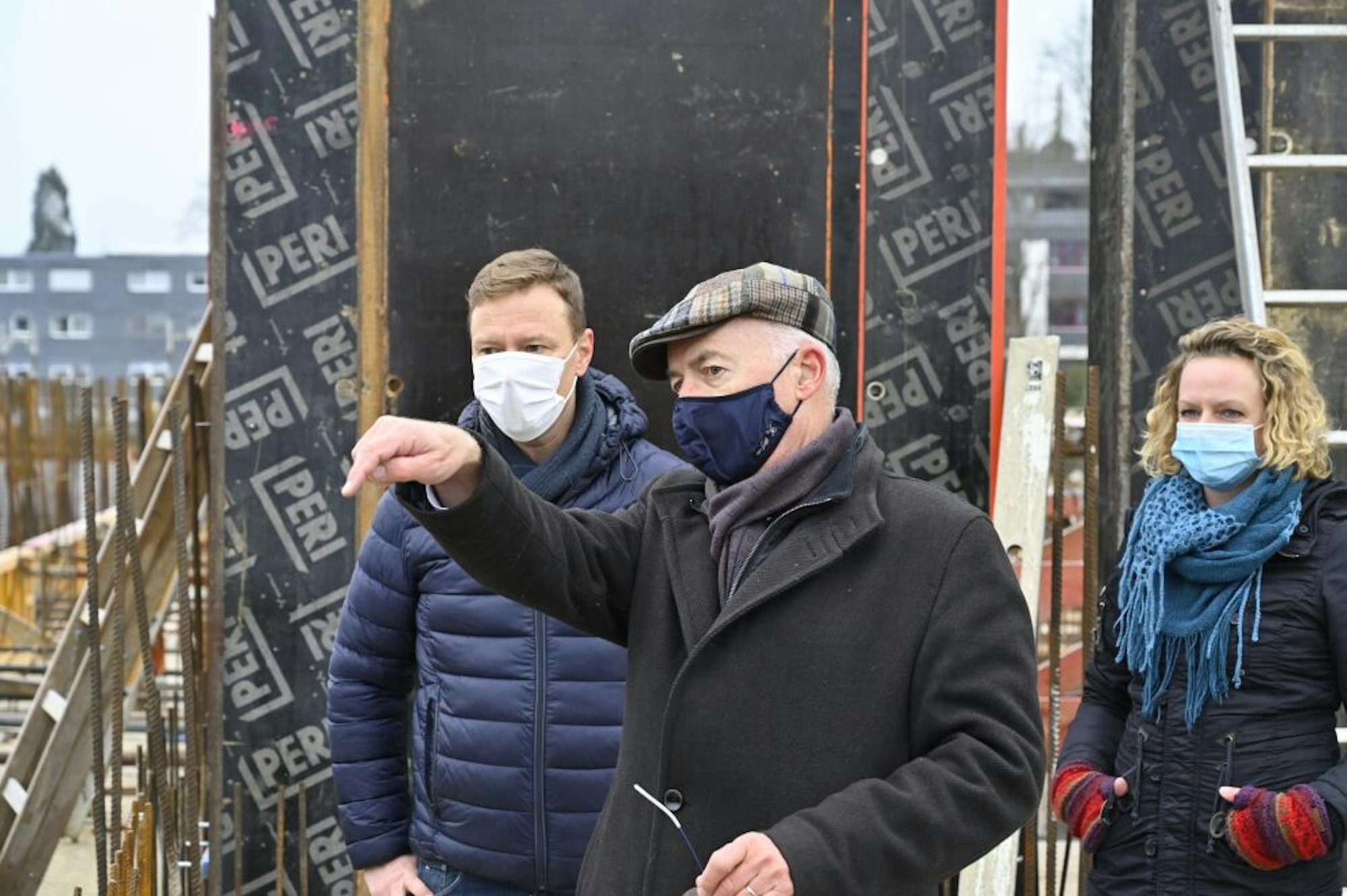 Zu den Besonderheiten des Gebäudes gehören, wie Korthaus Bernhard Opitz und dessen Begleitern erklärte, die Sonderkonstruktionen. Also die Teile, die bis zu zehn Meter auskragen und dabei teilweise über die öffentliche Verkehrsfläche ragen. In diesem Teil der neuen Halle 51 soll die schon mit Spannung erwartete Skybar beheimatet sein. „Allein in dem Querriegel werden deutlich mehr als 100 Tonnen Bewehrungsstahl eingebaut, teilweise in Sonderabmessungen, die wir auch in unseren anderen Großprojekten noch nie eingebaut haben“, berichtet der Bauunternehmer.