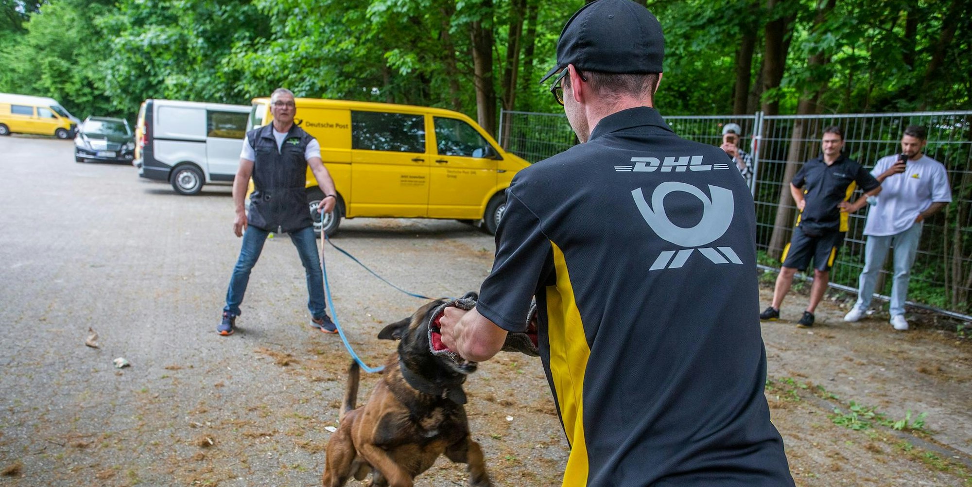 Die Situation ist an diesem Tag keine echte, sondern eine Simulation im Rahmen eines Hundetrainings für Mitarbeitende der Deutschen Post. Durchgeführt wird das Training von Hundetrainer und Polizist Michael Pfaff und Uwe Graute, der den Praxisteil mit Hündin Demi und Rüde Clip begleitet. Der Gartenzaun, über den Ralph Brenner und die anderen die Pakete reichen, besteht aus übereinander gestapelten gelben Postboxen.