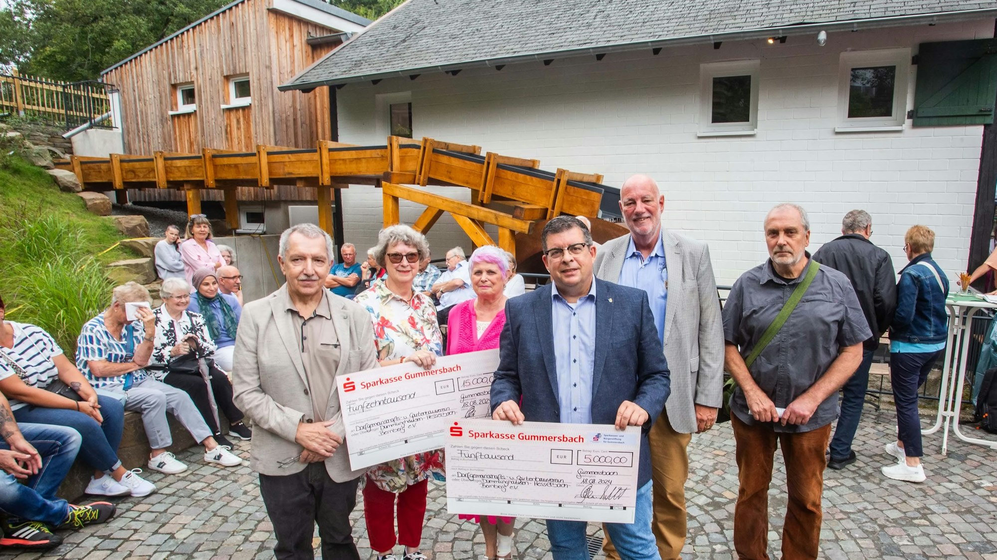 Zur Einweihungsfeier übergaben Sparkassenchef Frank Grebe und Bürgermeister Frank Helmenstein von der Sparkasse Gummersbach dem Dorfverein weitere Gelder in Höhe von 20.000 Euro und sicherten bereits für das kommende Jahr nochmal 20.000 Euro zu, so dass der Eigenanteil des Dorfvereins für den Umbau in Höhe von zehn Prozent nun auch gedeckt ist. „Die Mühle ist im kollektiven Bewusstsein der Gummersbacher“, sagt Helmenstein, der selbst viele Erinnerungen mit ihr verbindet, über den Wert der Dümmlinghauser Mühle, egal ob für Feten, Abifeiern oder
