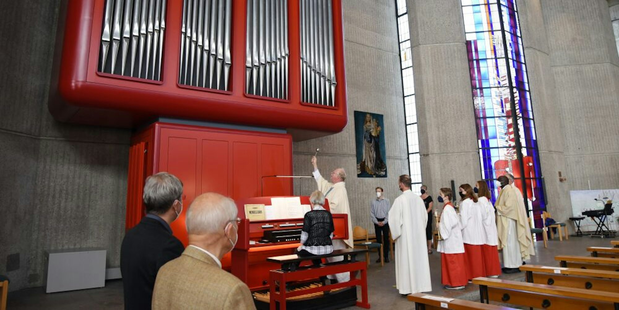 Knallroter Hingucker: Kreisdechant Christoph Bersch weihte die Orgel, Ursula Brendel begleitet darauf den ersten Gottesdienst.
