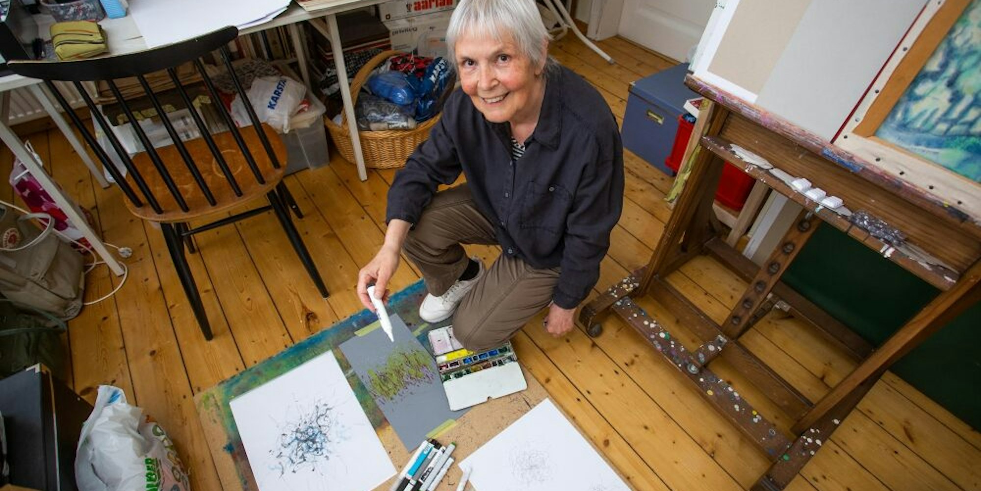 Gummersbach – Um in ihr Atelier zu kommen, muss Angela Gambke mehrere Treppen bewältigen. Dem Besucher kommt es vor, als ginge es einen Leuchtturm hinauf. Ihr Arbeitszimmer unter dem Dach des Hauses in der Gummersbacher Innenstadt ist klein, was man auch den Formaten ansieht, die sie dort bemalt. Aber der Raum hat Charme und Aura: „Mein Vermieter sagt, dass hier früher schon einmal ein Künstler gearbeitet hat.“