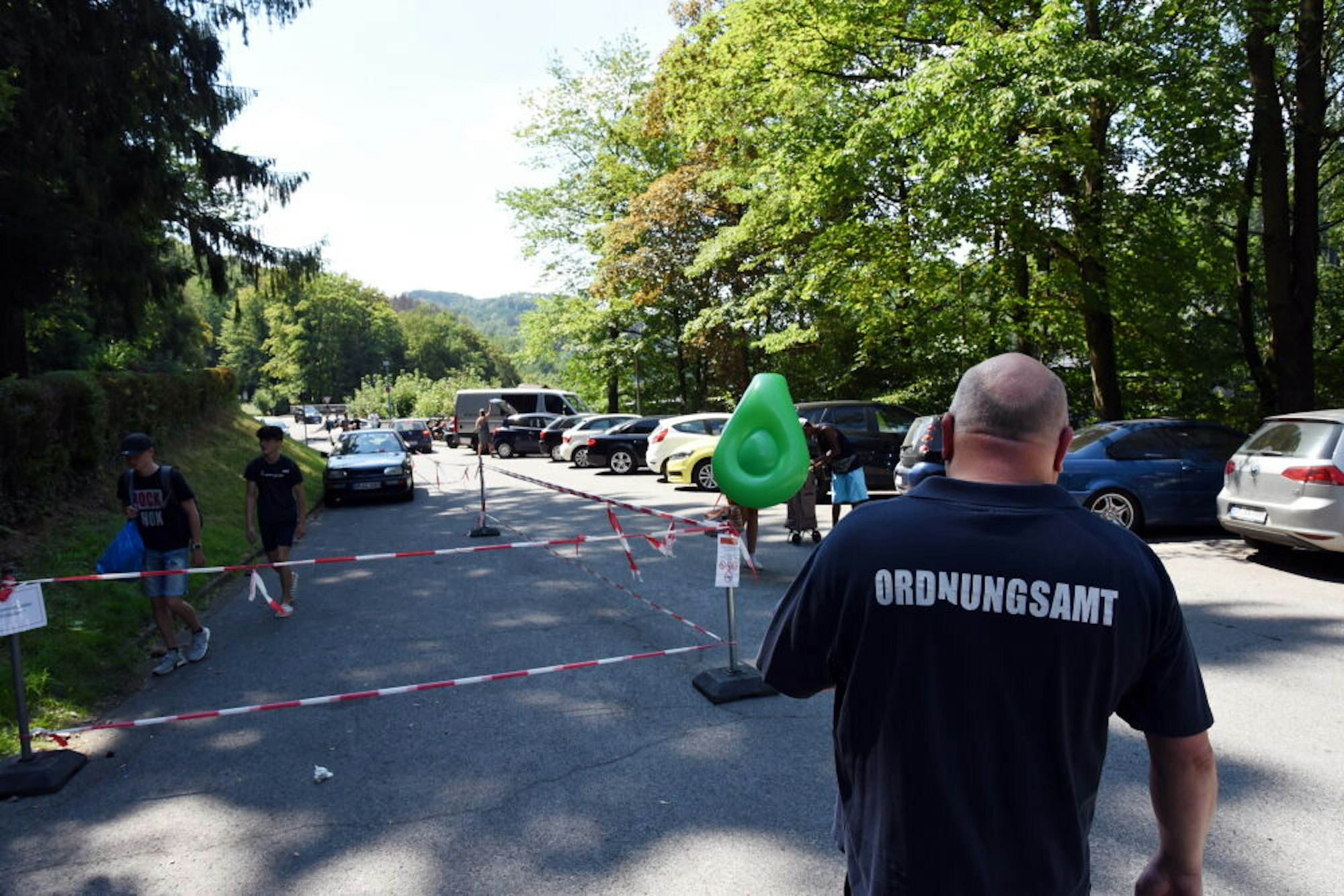 Ebenso voll sind die anderen Parkplätze an der Staumauer: „Die Autos werden schnell abgestellt, zum Beispiel auf dem Seitenstreifen der Straße – und das geht so weiter bis hinauf nach Lantenbach“, sagt eine Mitarbeiterin des Ordnungsamts, während sie Knöllchen schreibt. „Die Leute wollen nah am Wasser parken und nicht weit laufen.“ Dabei entdeckt sie ein falsch geparktes Auto, an dessen Fahrertür der Zündschlüssel steckt. Sie wundert sich: „Wünscht sich der Besitzer, dass wir das Auto wegfahren?“