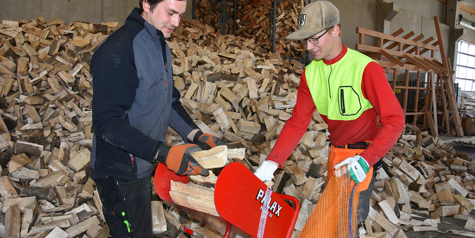 In handliche Gebinde verpacken Christoph Rosenbauer (l.) und Mitarbeiter Jonas Metzger das verbleibende Holz.