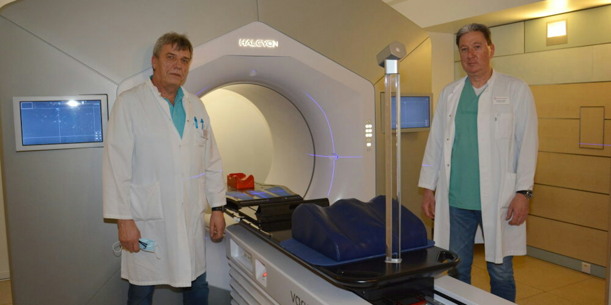 Gummersbach – Bevor der Linearbeschleuniger im Kreiskrankenhaus Gummersbach eingebaut werden konnte, musste renoviert werden. Die Schutzwände im Bestrahlungsraum wurden ertüchtigt, neue Versorgungskabel verlegt und die Computertechnik auf den neuesten Stand gebracht. Nun sind das neue Bestrahlungsgerät mit dem Namen Halcyon und der Behandlungstisch auf einem Spezialfundament fest im Boden verankert – und 26 Patienten werden seit einigen Wochen mit der neuesten Errungenschaft des Klinikums Oberberg behandelt.