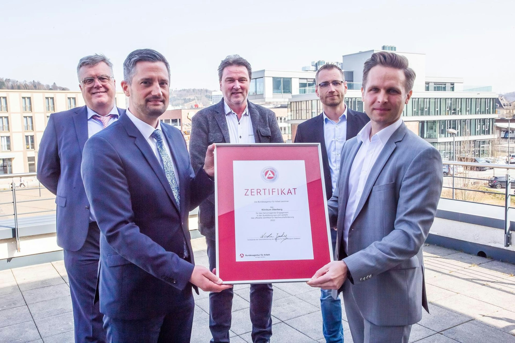 Am Montag überreicht Pascal Sahlmen (r.) von der Agentur das Zertifikat an Geschäftsführer Sascha Klein (l.) und weitere Vertreter des Klinikums Oberberg.