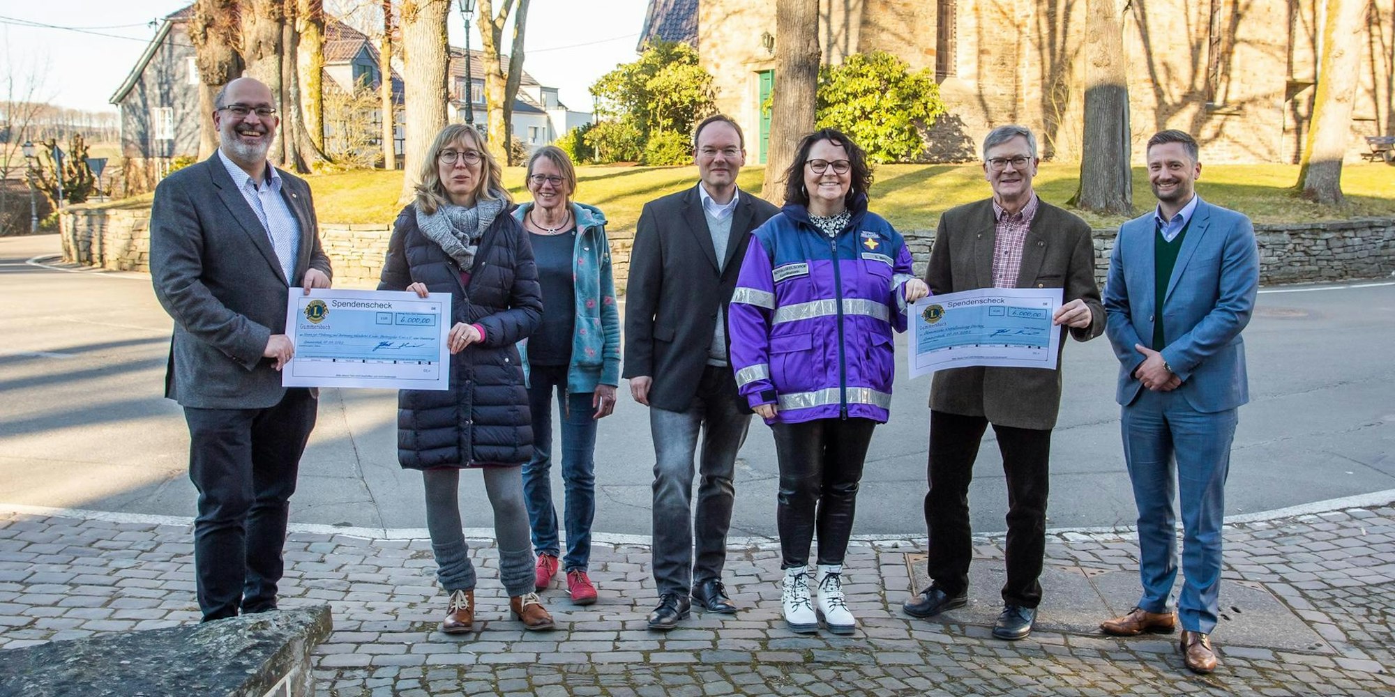 Spender und Empfänger: In Hülsenbusch überreichten Vertreter der Lions Schecks an die Notfallseelsorge und das Haus früher Hilfen.