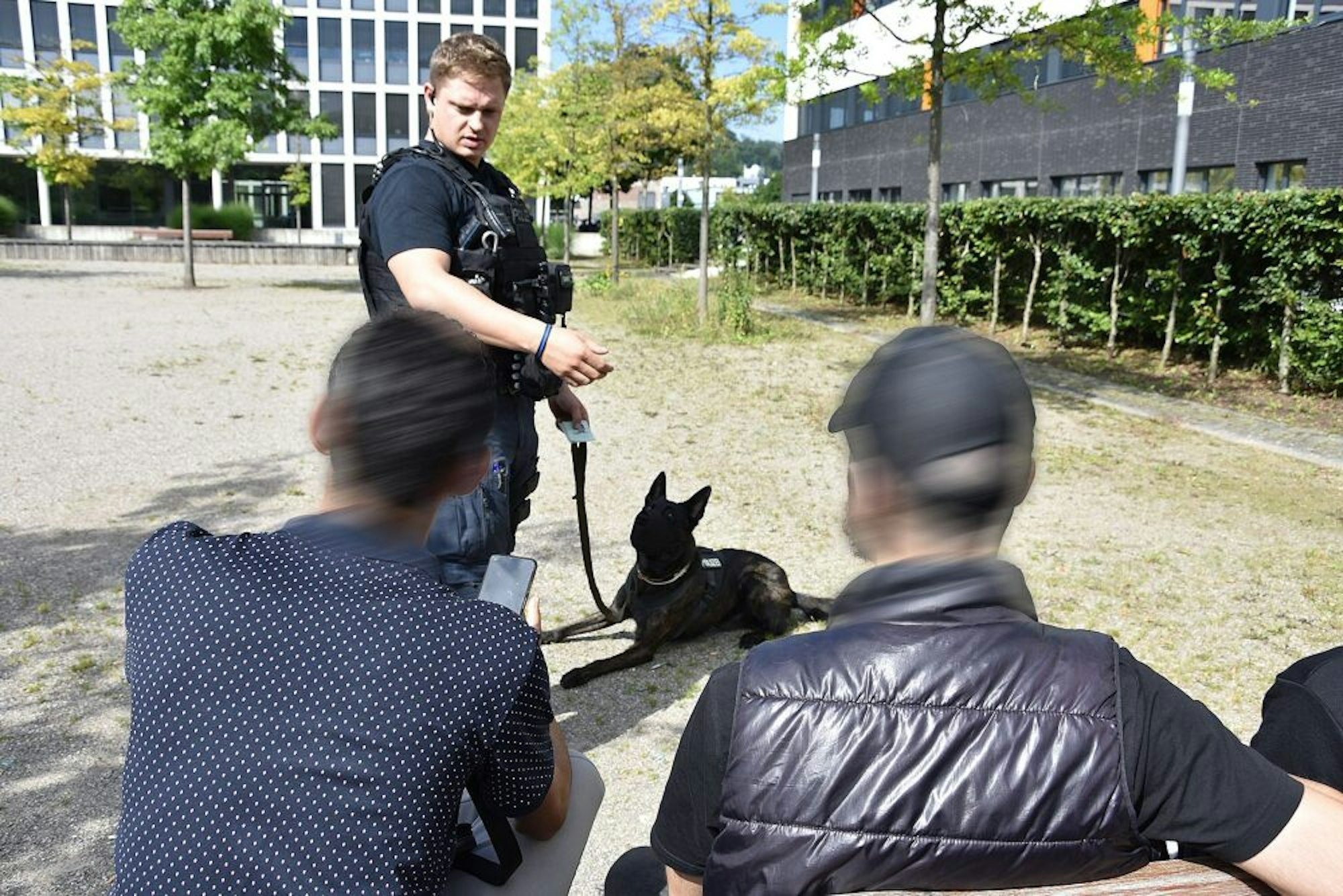 Plötzlich wird Tay unruhig, nimmt Witterung auf, steuert zielstrebig auf eine Gruppe von sechs Männern zu, die im Schutz einer Hecke zusammen hocken. Tays feine Nase wittert Rauschgift. „Personenkontrolle!“ Die Polizisten prüfen die Ausweise, Rucksäcke werden kontrolliert, in einer Tasche findet sich Cannabis. Die Männer werden durchsucht. „Man weiß nie, was in so einer Situation passiert“, sagt Laegner. Da sei es ein gutes Gefühl, dass dem Hund keine Bewegung entgeht.